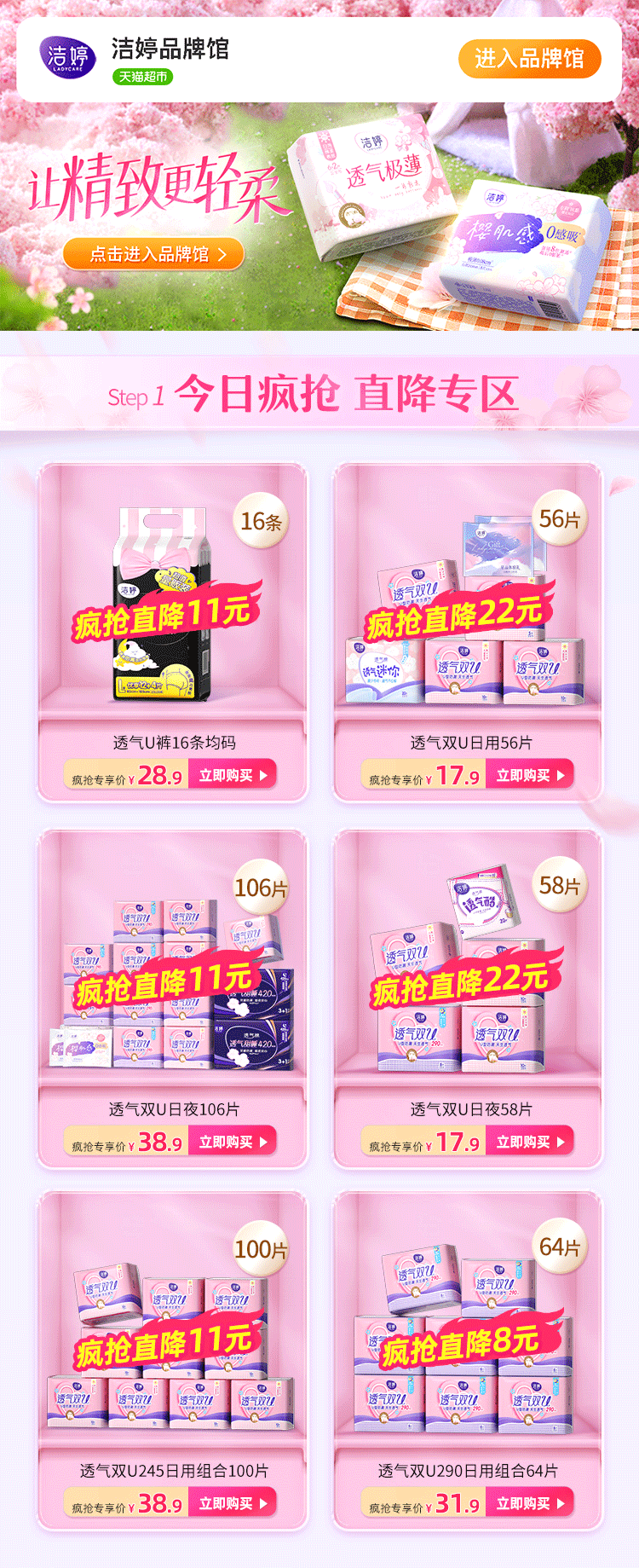 商品简介:【下单立减29元,领1元券,返10元猫卡,88vip到手27.9元,折0.24元/片!】洁婷卫生巾透气双U全周期日夜用棉柔亲肤防漏姨妈巾正品整箱!趁好价,快去抢购,超级划算~