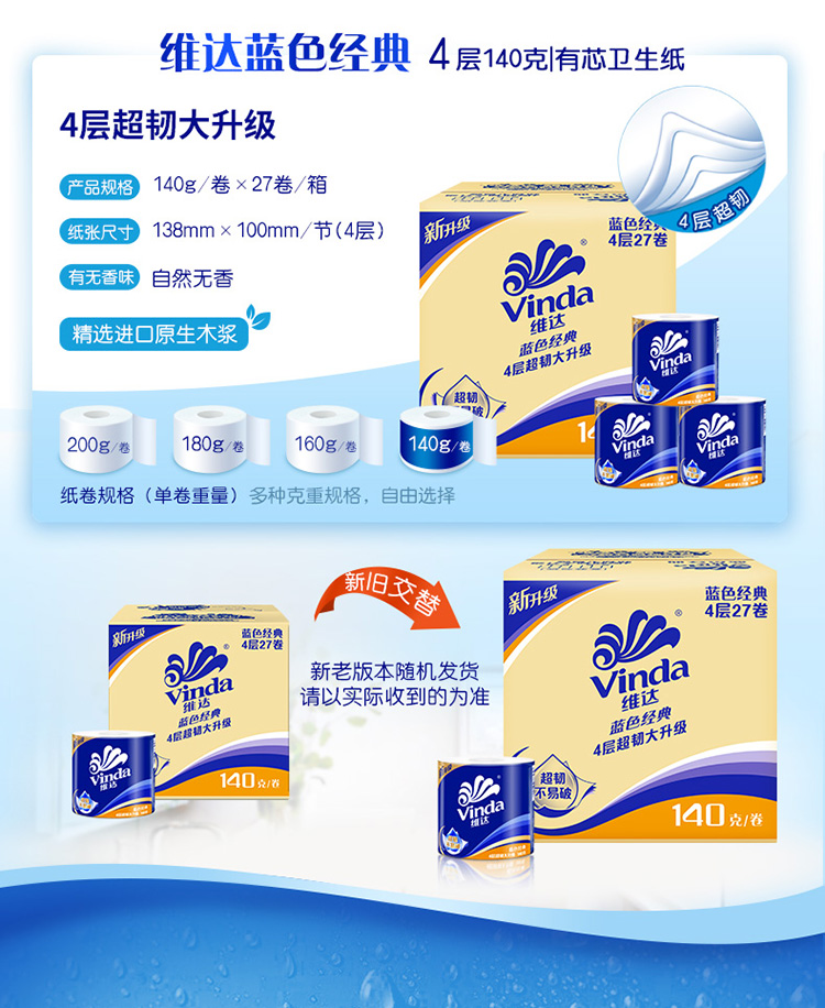 商品名称:【赵丽颖同款】维达蓝色经典有芯卷纸4层140克27卷卫生纸新旧交替