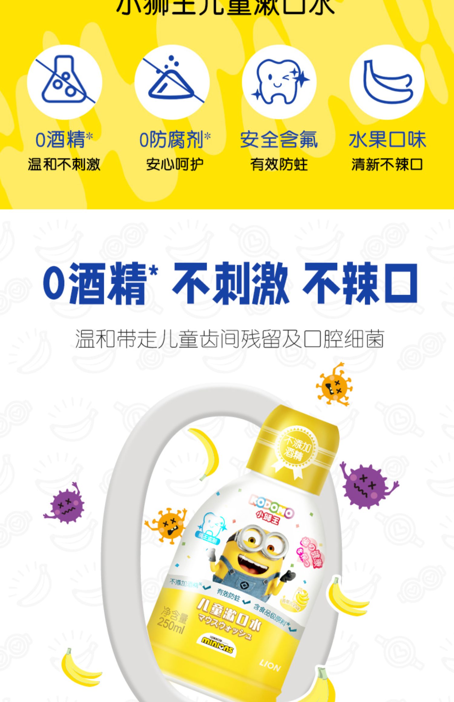 商品名称:狮王KODOMO小狮王儿童漱口水无酒精防蛀小黄人款香蕉牛奶味250ml
