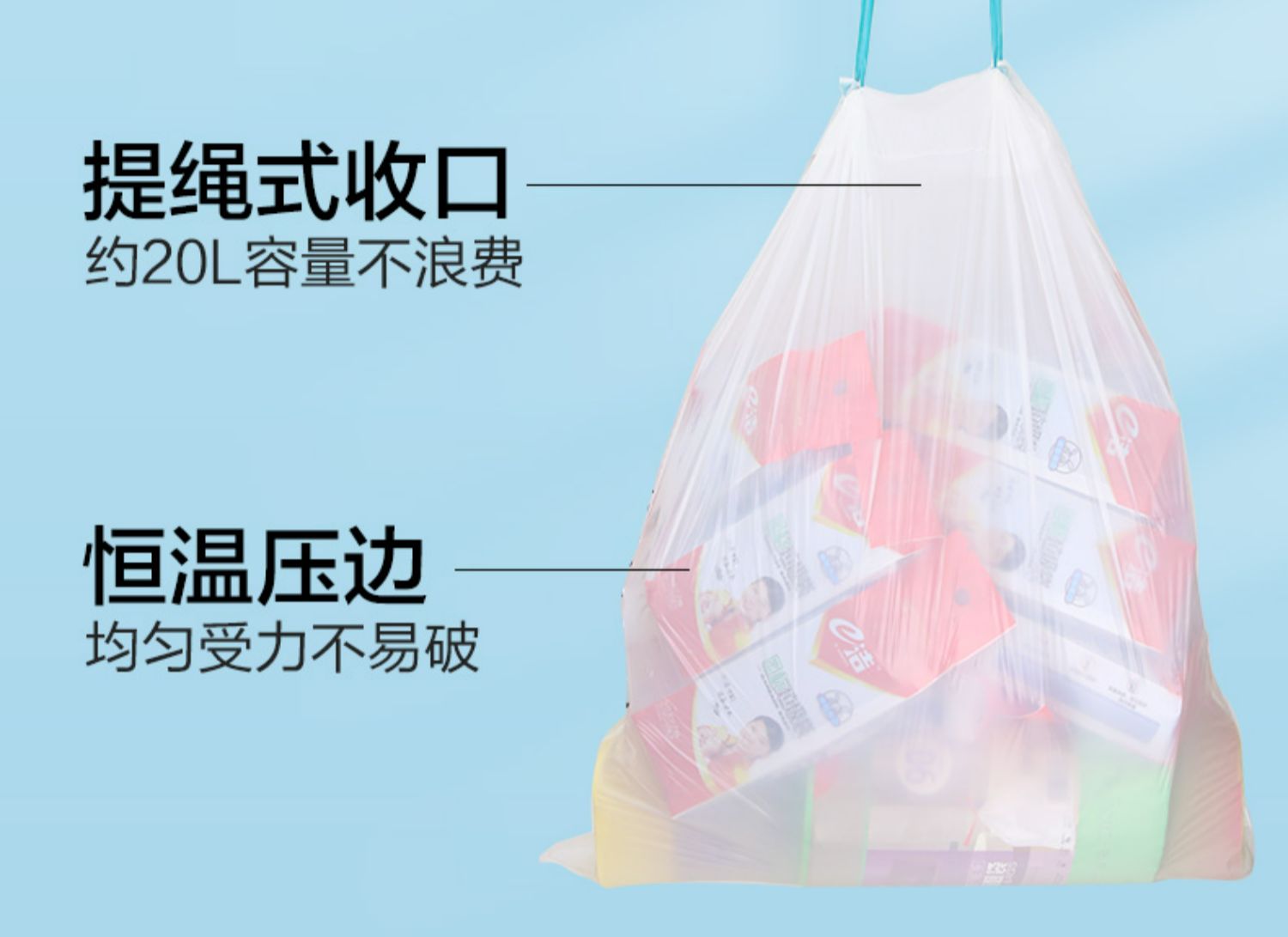 商品简介:满减到手3.1元【叠加首单4+淘金币0.41,仅0.07/只】e洁自动收口垃圾袋,不漏不脏手,更加人性化提绳设计,让使用者不易勒手,承重强,不易脱落!