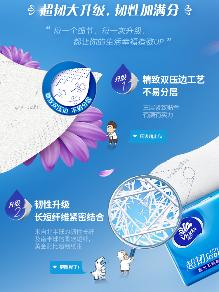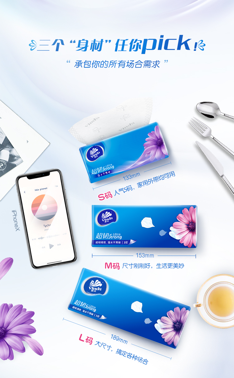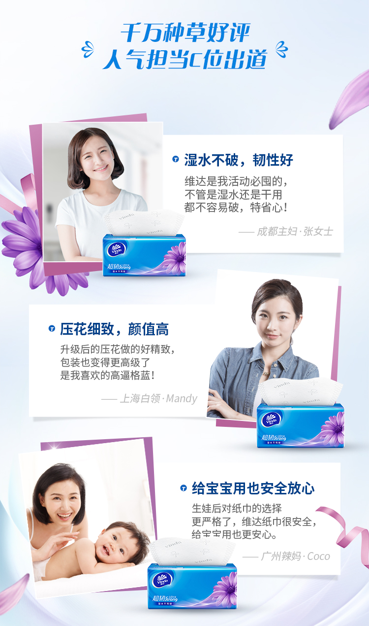 原生木浆抽纸,超韧品质无香面巾纸,柔软舒适湿水不易破,纸张细腻柔韧更耐用,优雅艺术小碎花包装,健康生活从维达开始