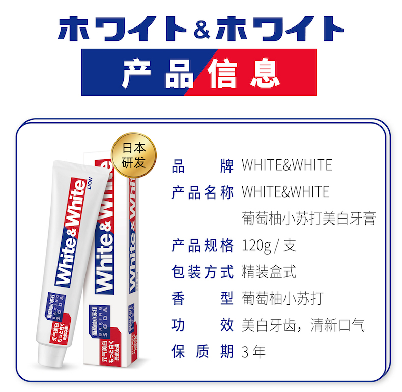 商品名称:LION狮王WHITE&WHITE大白氨基酸益生菌小苏打美白牙膏防蛀护龈