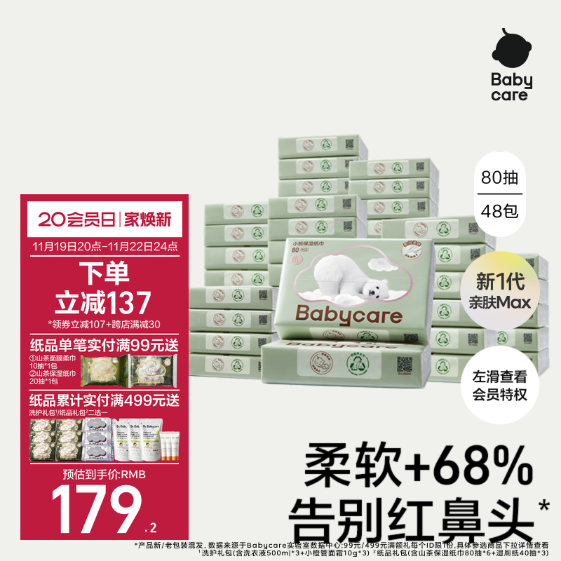 商品简介:【拍1件108抽*15包127.9-40券-12.79满减(凑300-30)=到手价75.11,折5/包】超赞,babycare云柔巾,新生专用保湿乳霜,原生木浆,添加高效保湿因子,反复擦拭不泛红。