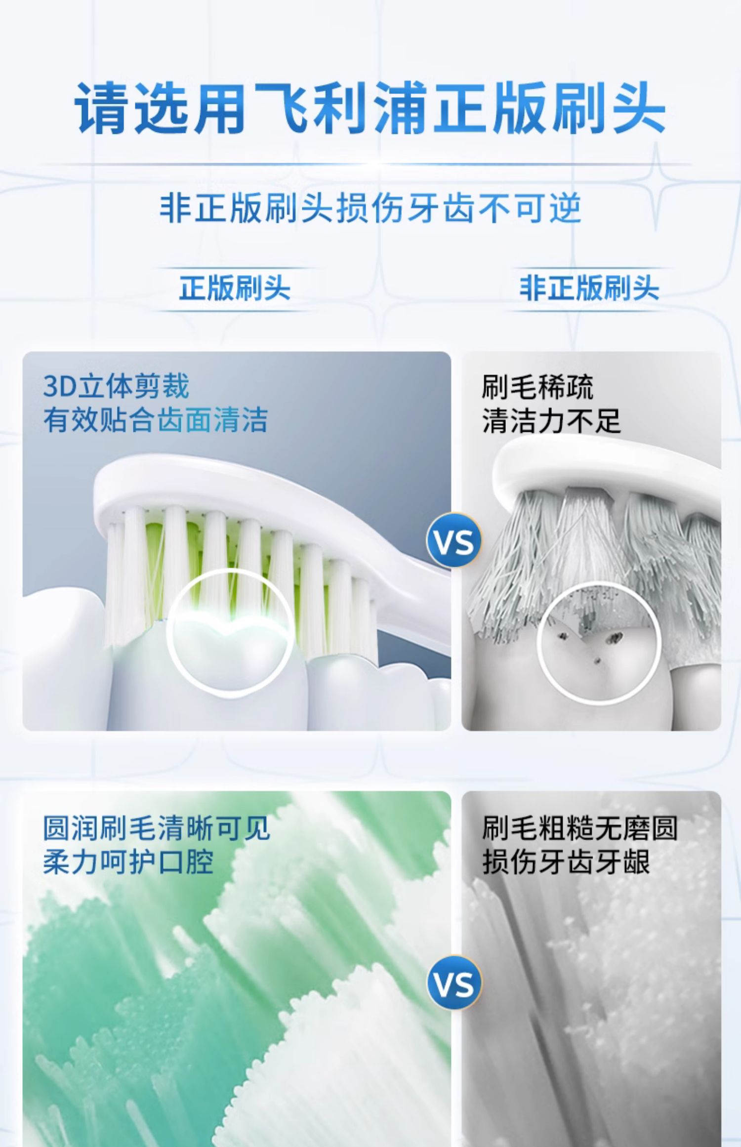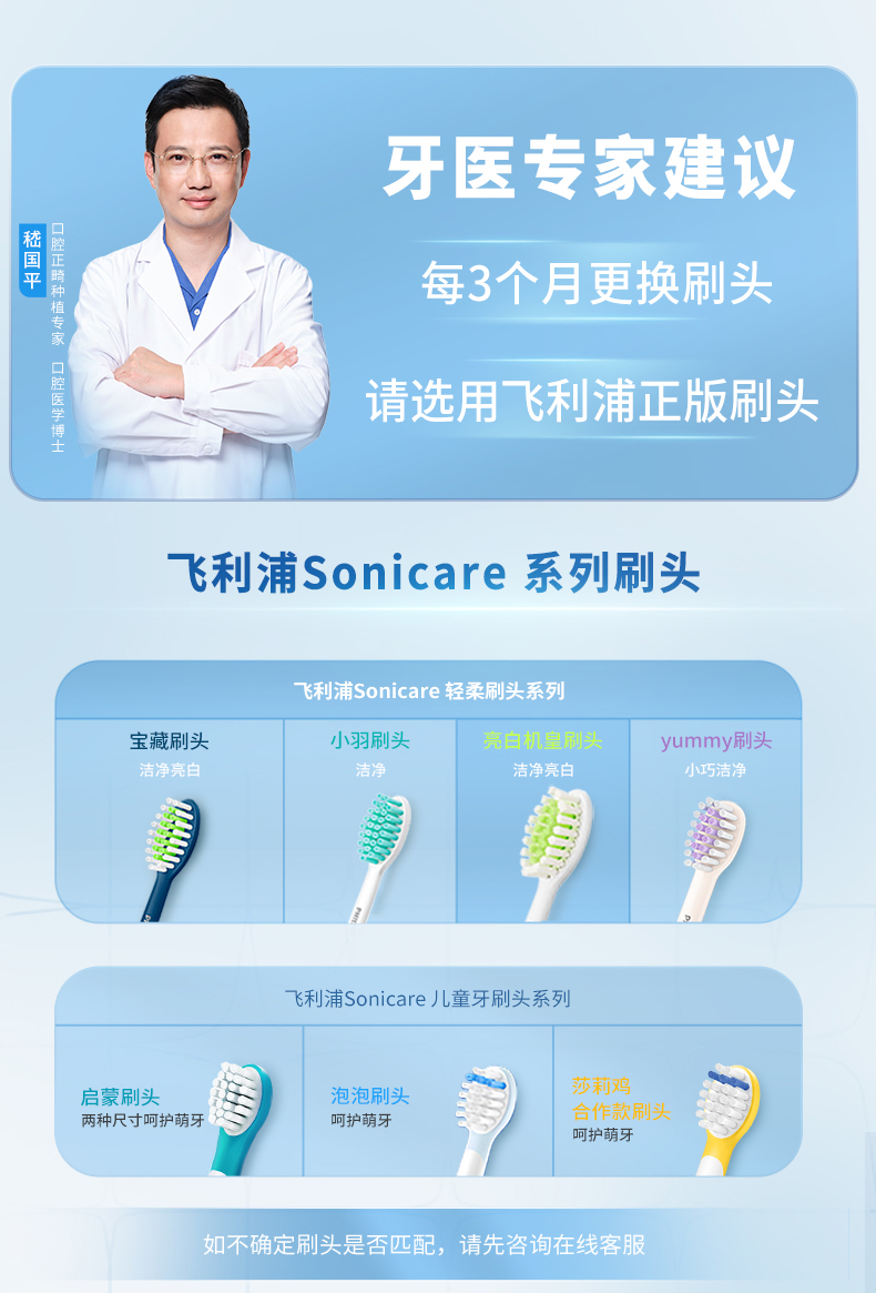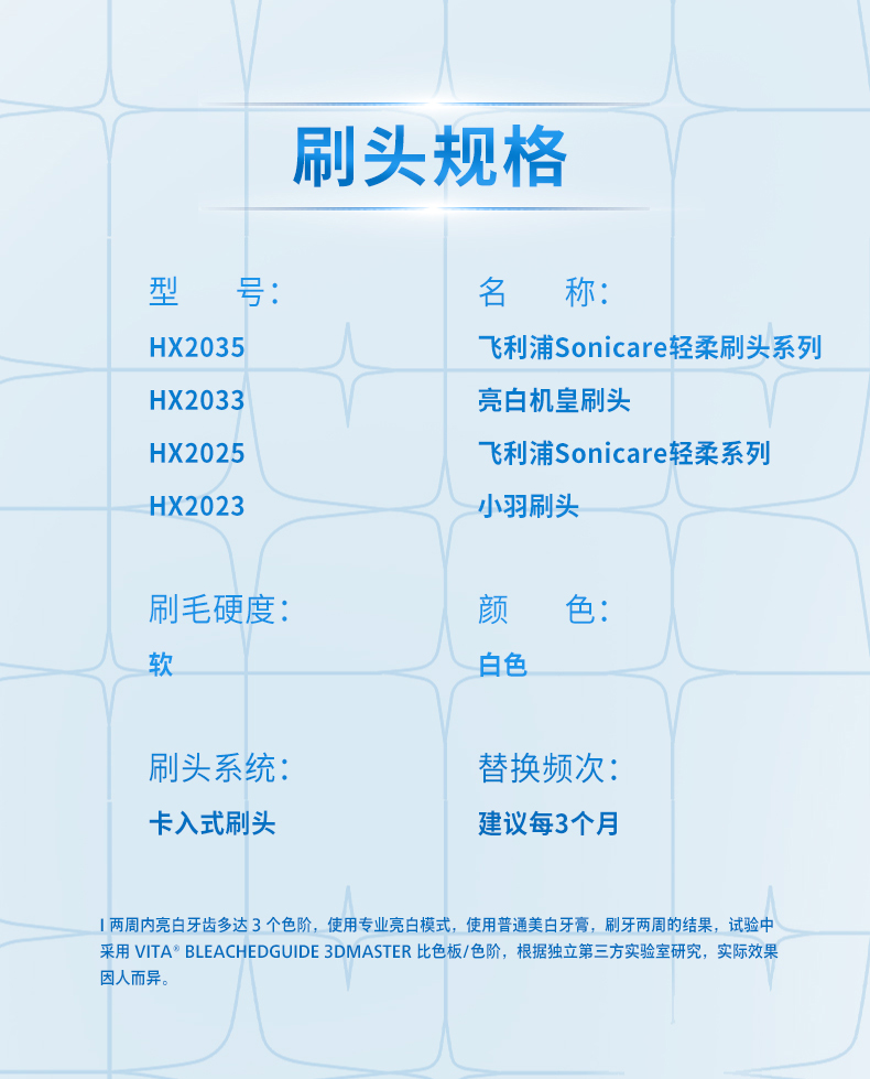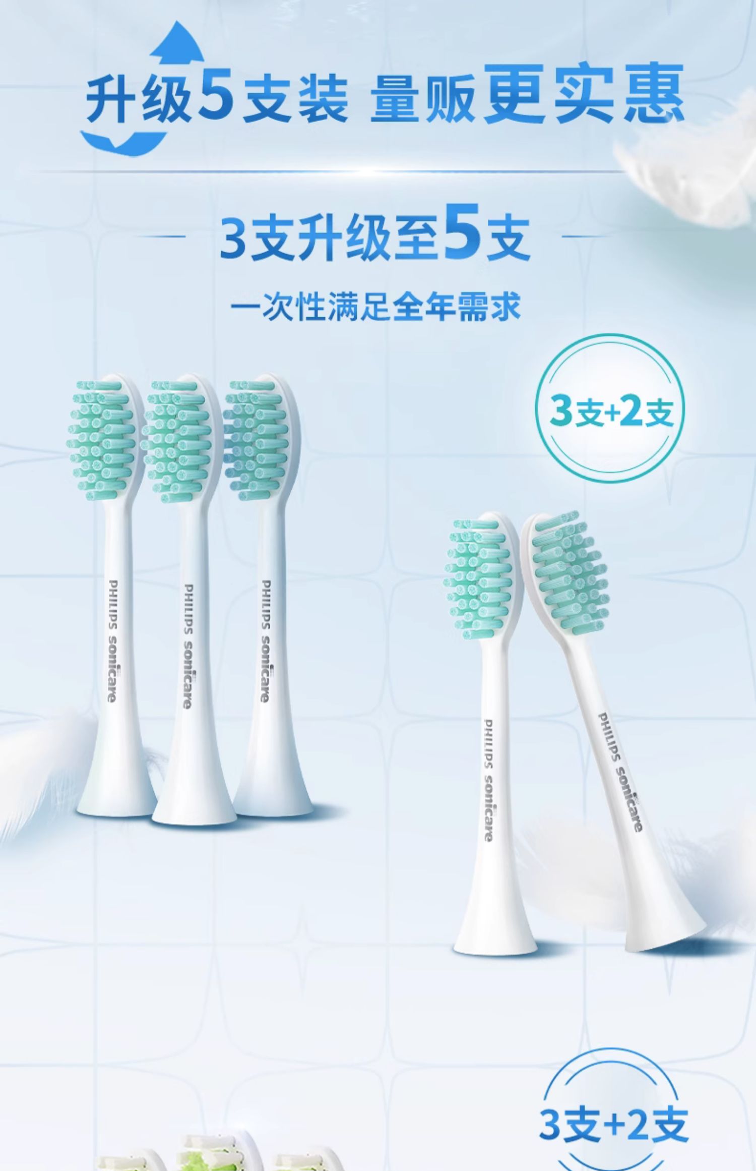 商品简介:双11飞利浦清洁/亮白型刷头升级5支装,一次性满足全年需求;3D软毛刷,刷面3D立体剪裁,深入净齿柔和亮白,专护亚洲敏感牙龈,呵护娇嫩口腔;每3个月更换刷头,请选用飞利浦正版刷头。