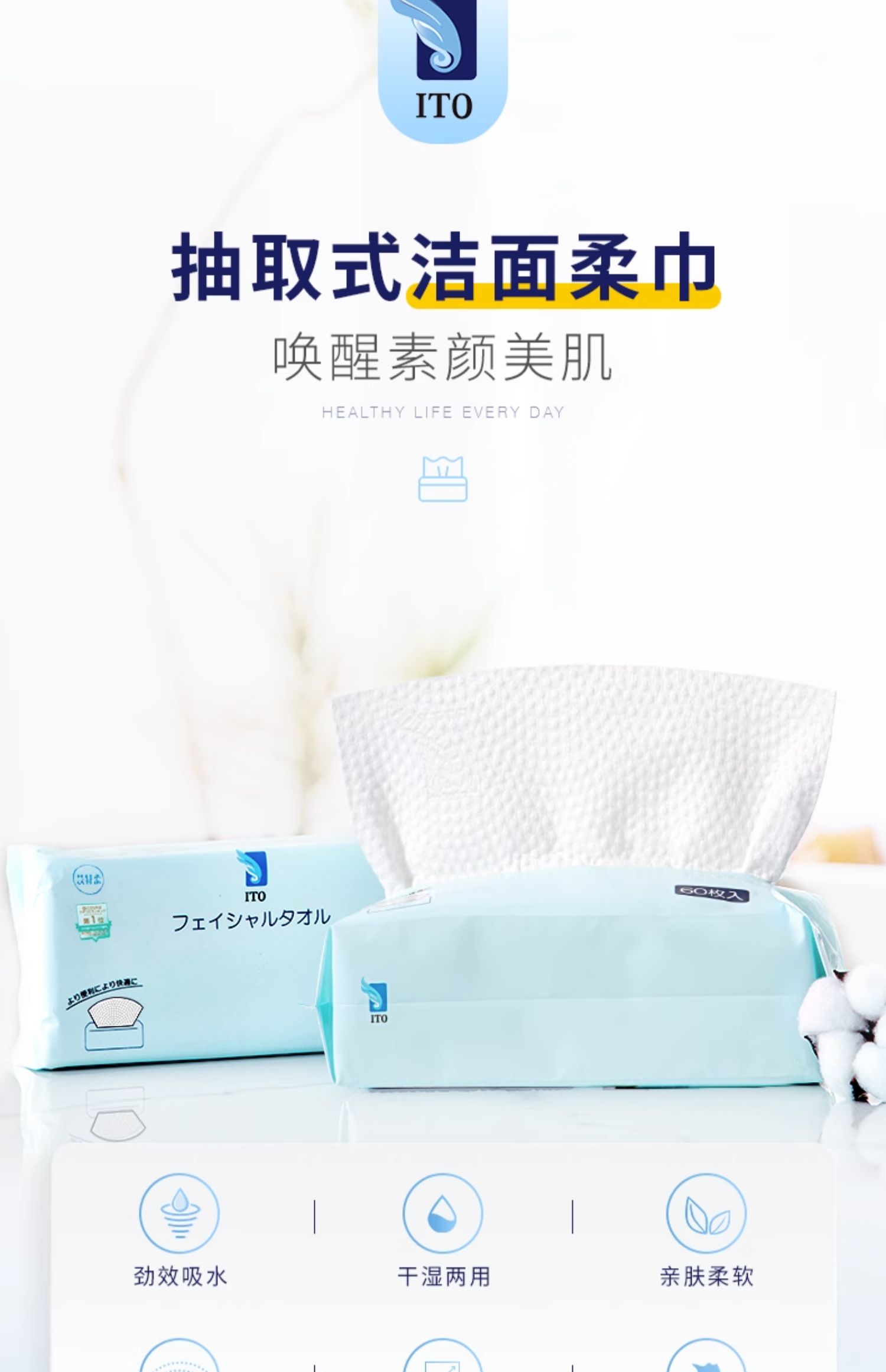 商品简介:洗脸就用ITO,双面设计,一面清洁一面护肤,抽取式洁面柔巾唤醒素颜美肌~