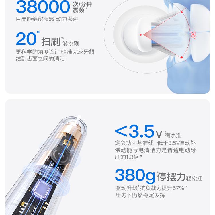 商品简介:【备注额外加送:到手4刷头+赠品】标配2刷头+旅行装牙膏2支,备注666加送2个刷头+1支120g泡感牙膏,行业首创匀净力系统,搭配专利恒压抗负载电机动力直达菌斑,6轴陀螺仪搭配0.96寸超级大屏,实时反馈盲区全覆盖实现口腔智算,一体机身实现IPX8级防水,110天长效续航充电无忧。