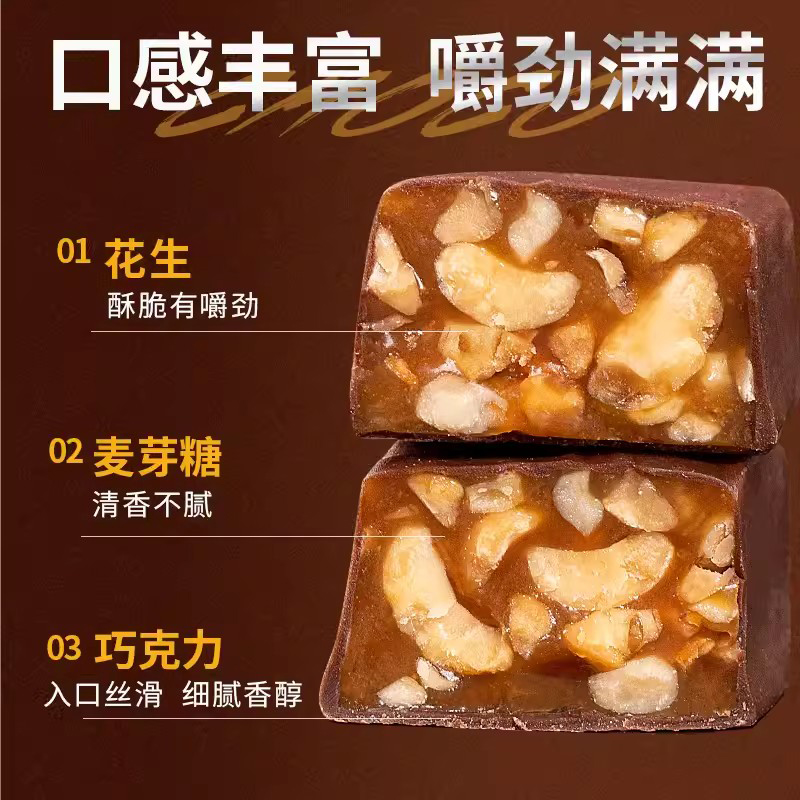商品简介:【18条】花生夹心巧克力士力类架黑巧克力零食年货节送礼批发(代可可脂)口感丰富,嚼劲满满。花生酥脆有嚼劲,麦芽糖清香不腻,巧克力入口丝滑,细腻香醇。