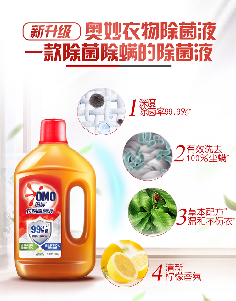 商品介绍:奥妙去渍抑菌除螨柠檬除菌液1.8kgX2瓶