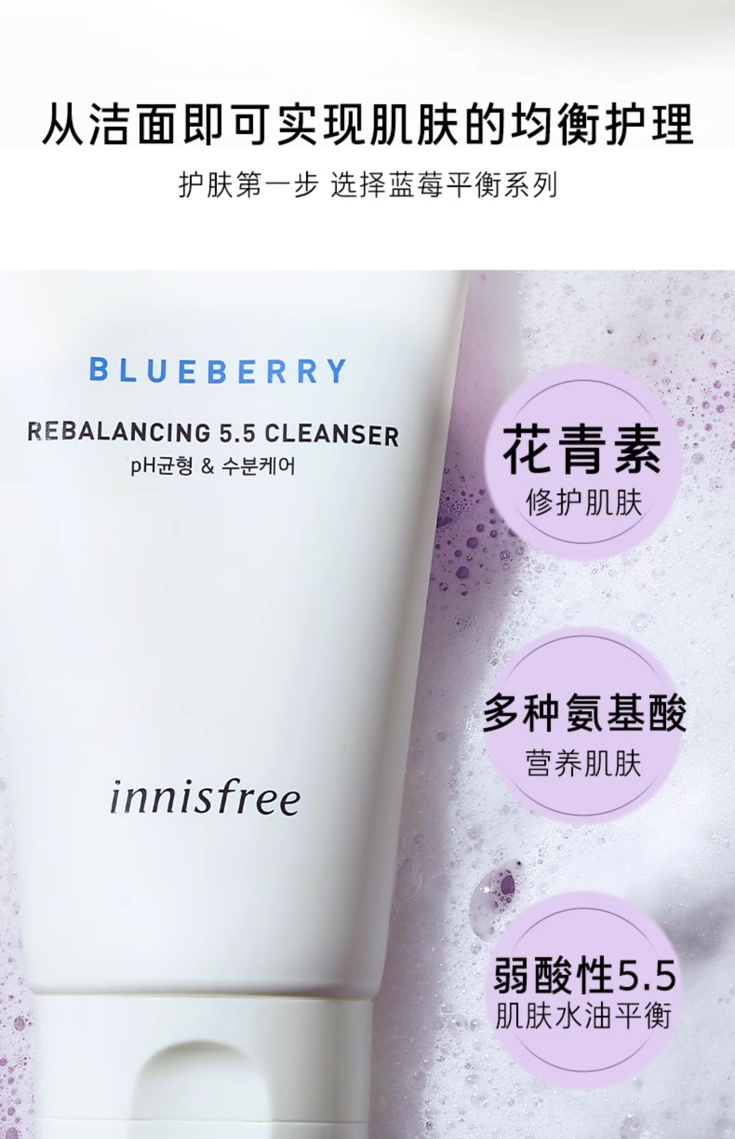 商品简介:【悦诗风吟innisfree,100ml*2支】商超品牌,正品官方旗舰店!蓝莓氨基酸洁面乳洗面奶,好推开不黏腻,调节皮肤水油平衡,舒缓清洁毛孔,韩国进口大牌,用过的都说好【弱敏肌适用】
