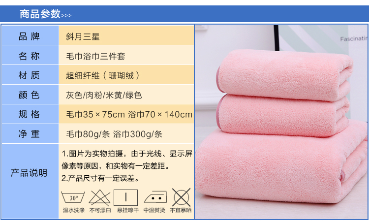 商品介绍:有首单!斜月三星柔软珊瑚绒浴巾毛巾2条
