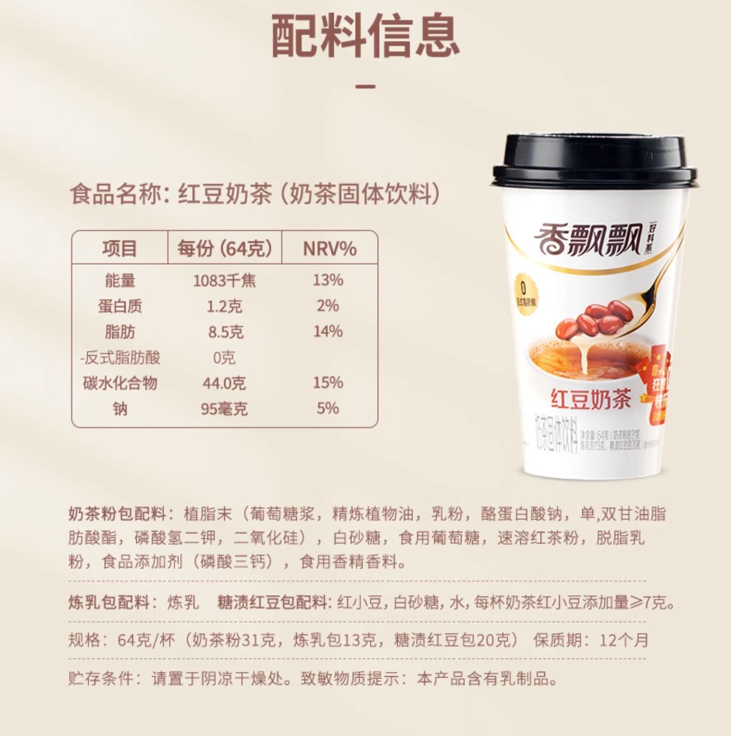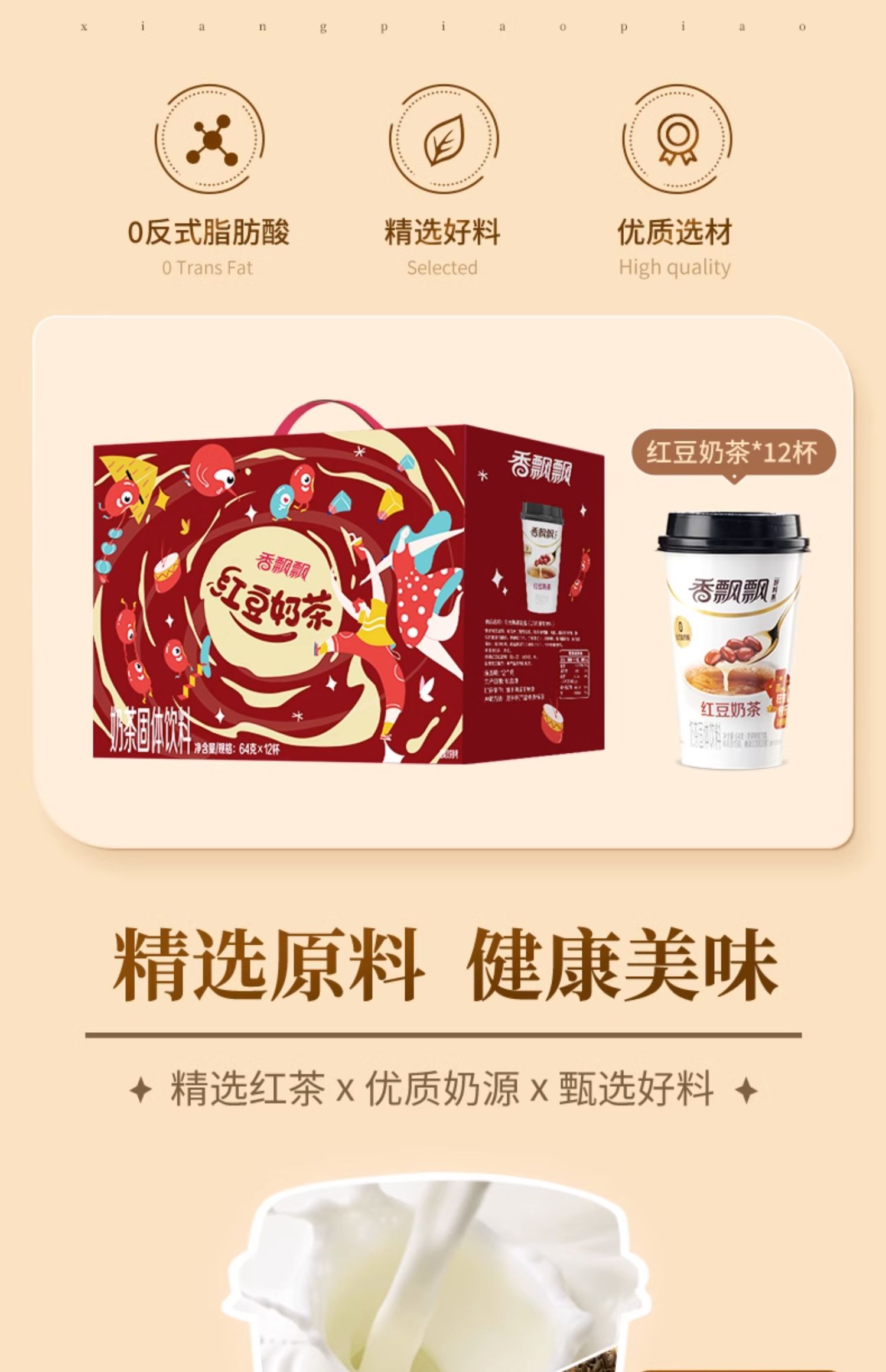 商品简介:【赠曼优优袋装奶茶随机10袋,会员领5元无门槛券到手51.9】香飘飘经典红豆礼盒12杯整箱,红豆完整饱满,放入糖,温柔熬煮,软糯香甜,口感丝滑,温暖香醇。0反式脂肪酸,精选好料,满满的回忆感,随时随地来一杯!