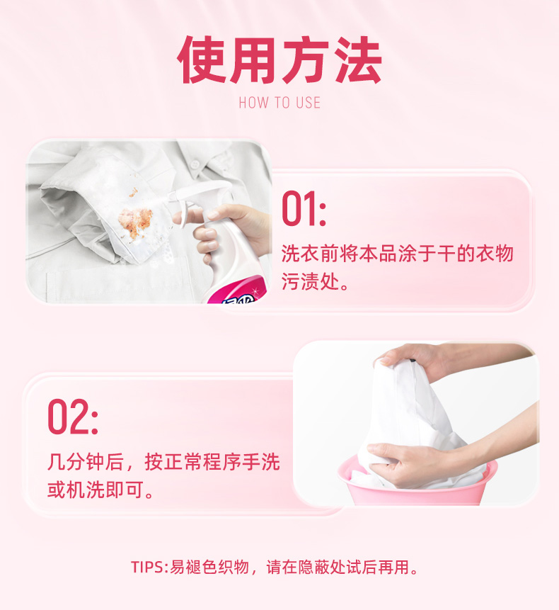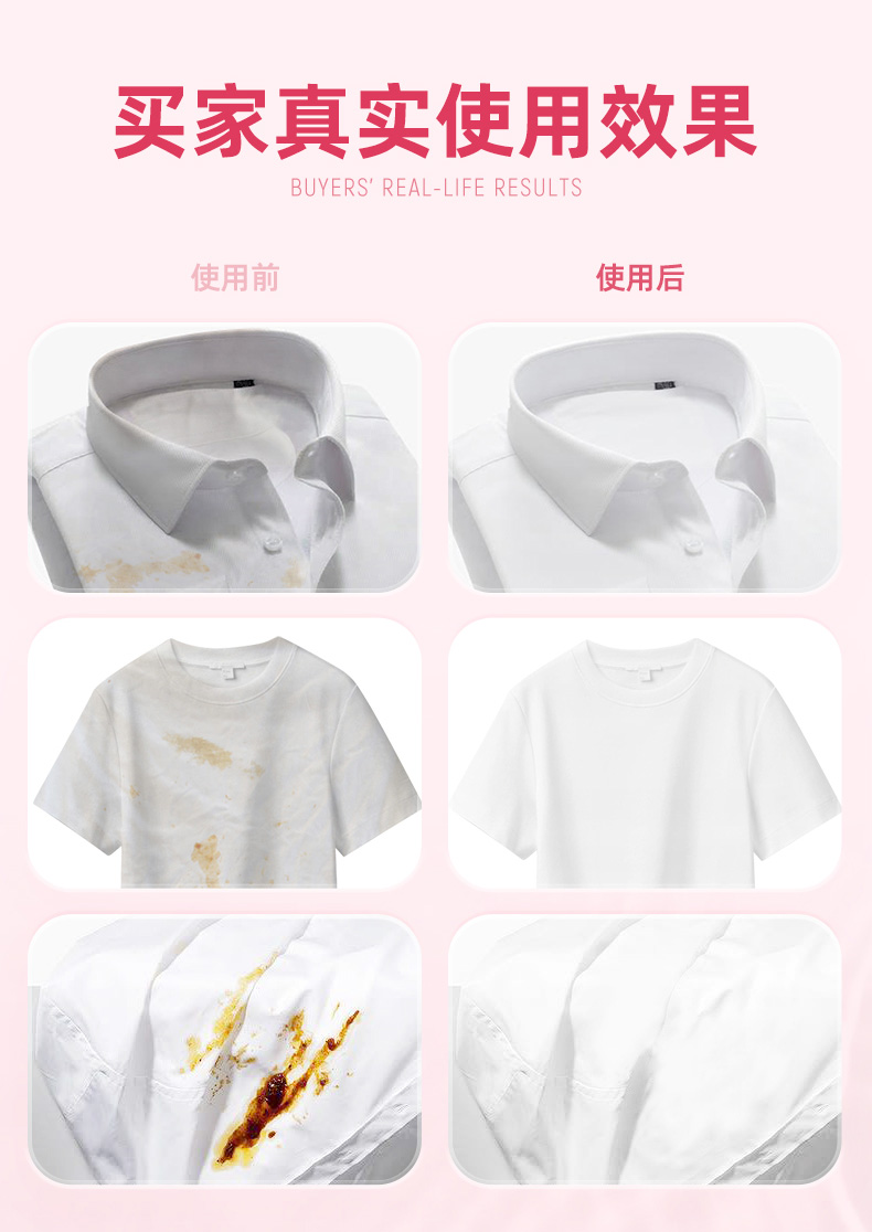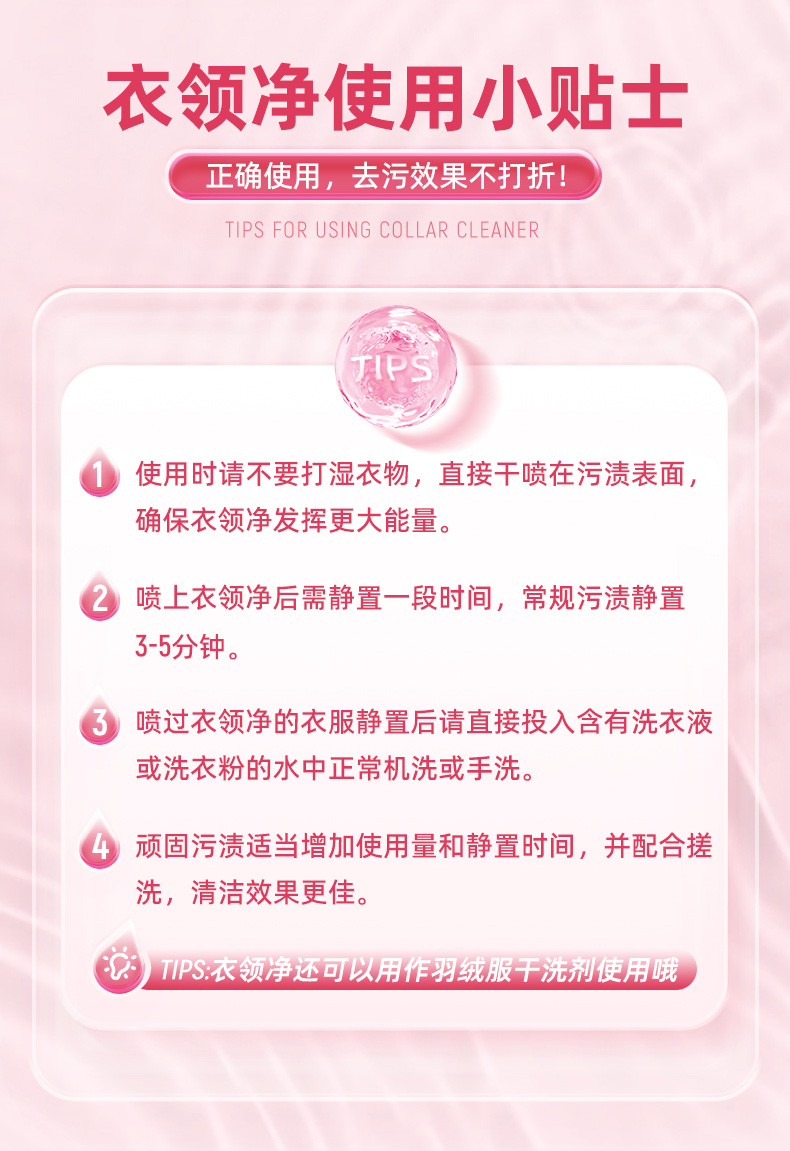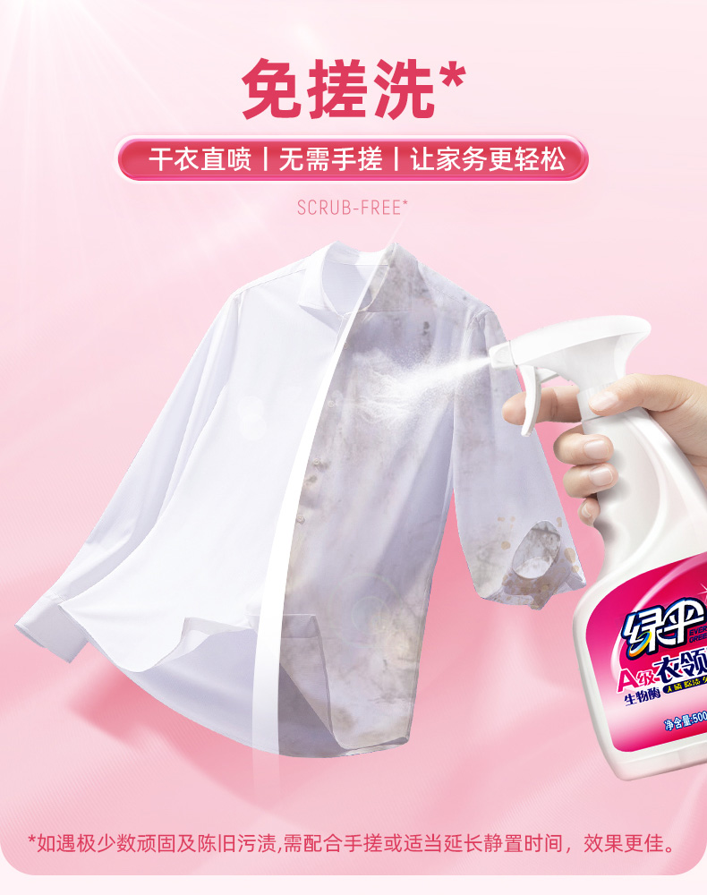 商品简介:袖口免搓洗,清新洁净,轻轻一喷,解放你的双手,让洗衣变的更简单!不添加荧光剂~清香怡人,洗完衣物柔软不发黄,不发硬