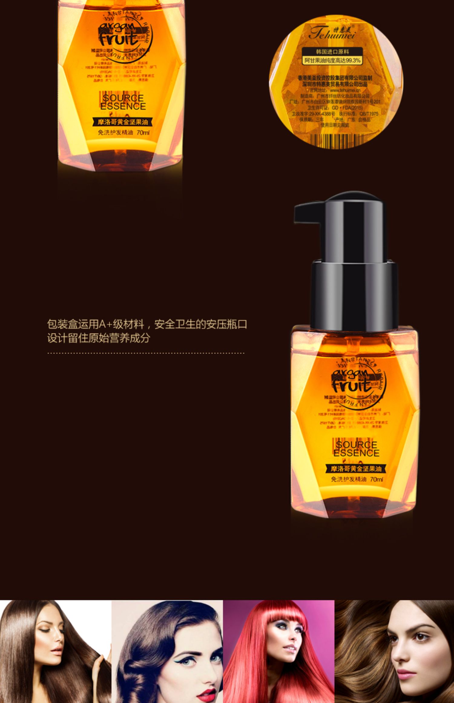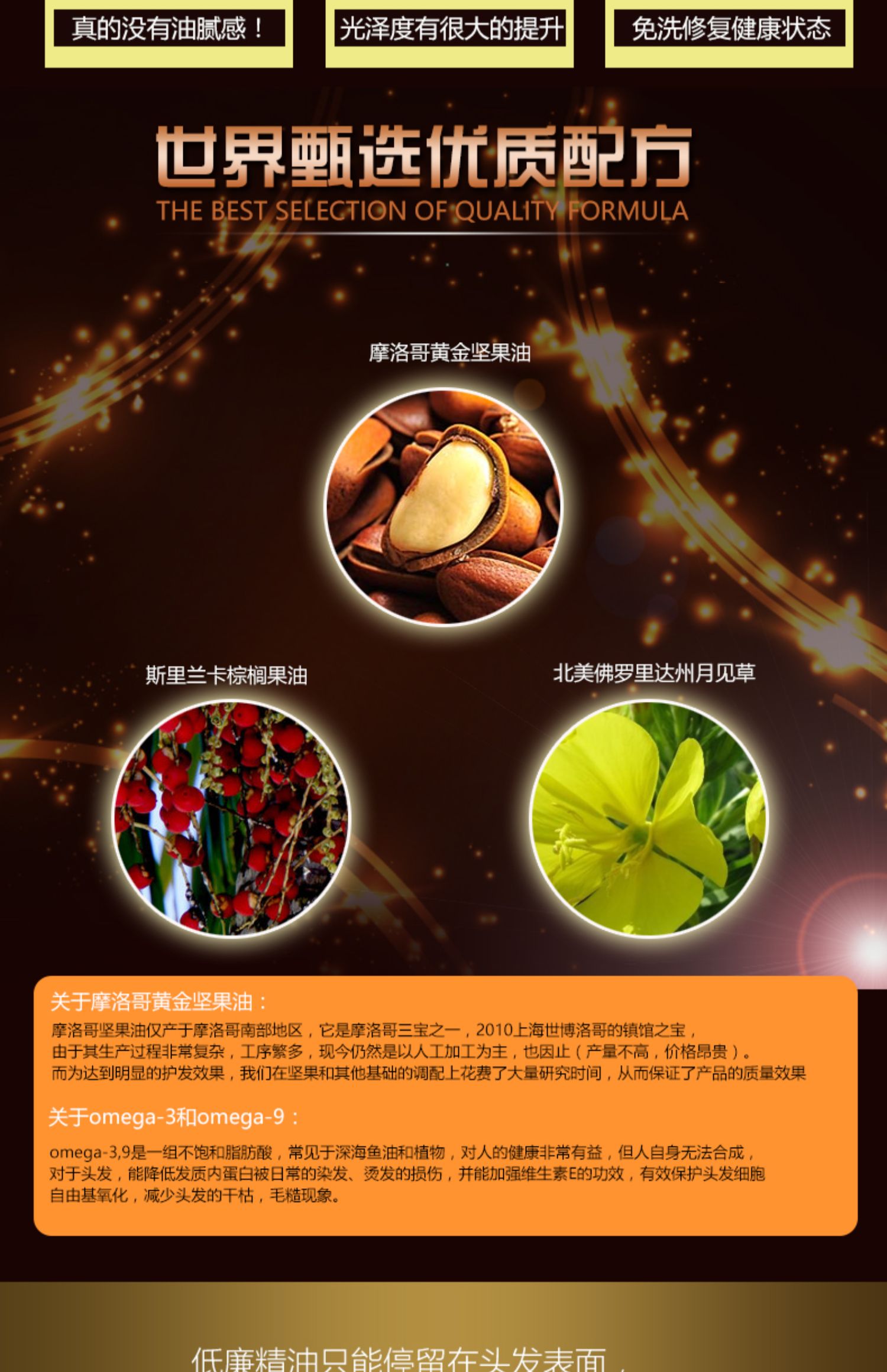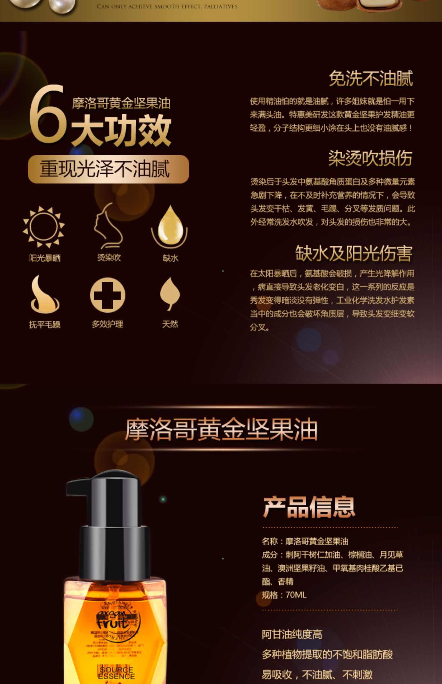 商品简介:护发精油!含丰富维他命E,快速渗透毛囊,补充头发营养,一抹顺滑不油腻,告别蓬乱打结,颜值更上一层楼!