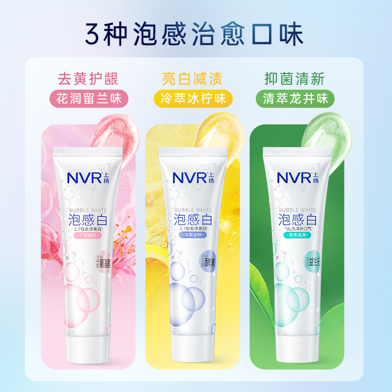 商品简介:【拍4支送8支小样+3支牙刷】NVR泡感白美白牙膏,日夜兼修,密泡科技,双重酵素强效溶解牙渍,酵出你的大白牙,多效呵护,满足多种口腔需求,从齿不再忍“气"吞声啦~