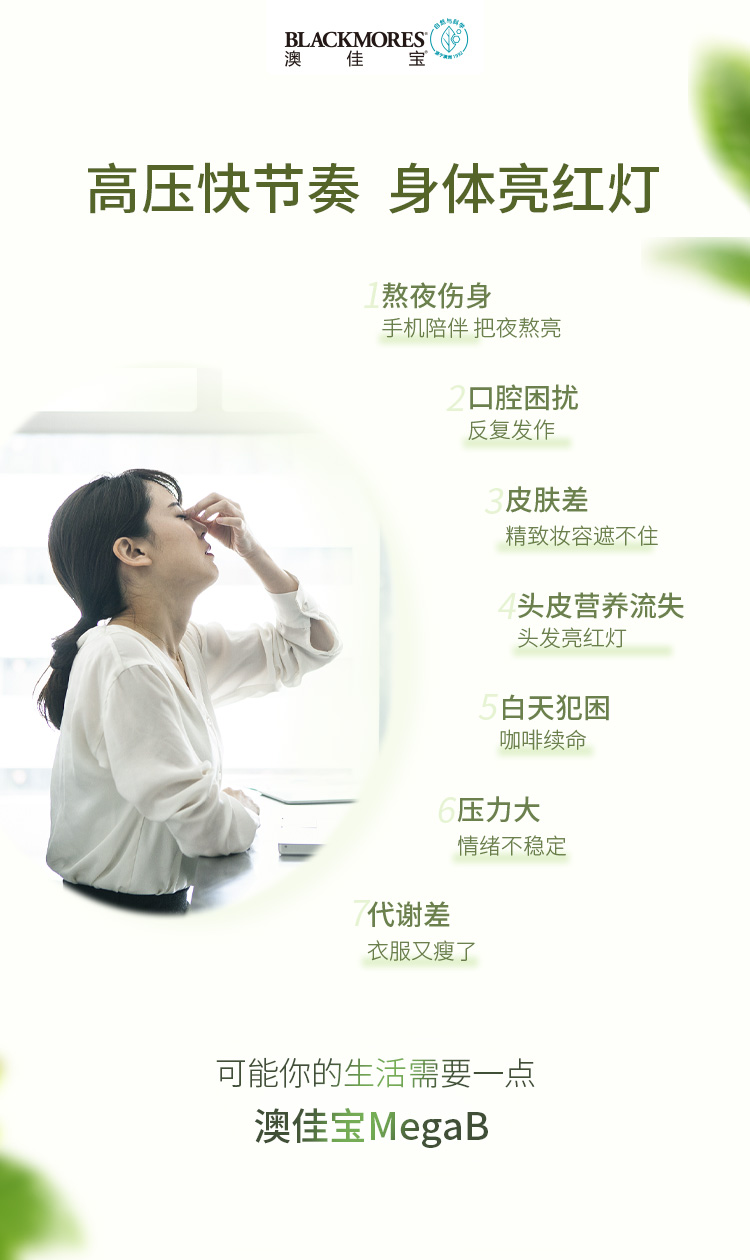 商品简介:一瓶富含八大B族营养素,帮助食物转化为能量,舒缓口腔问题,放松神经系统,让生活充满活力,吃嘛嘛香!