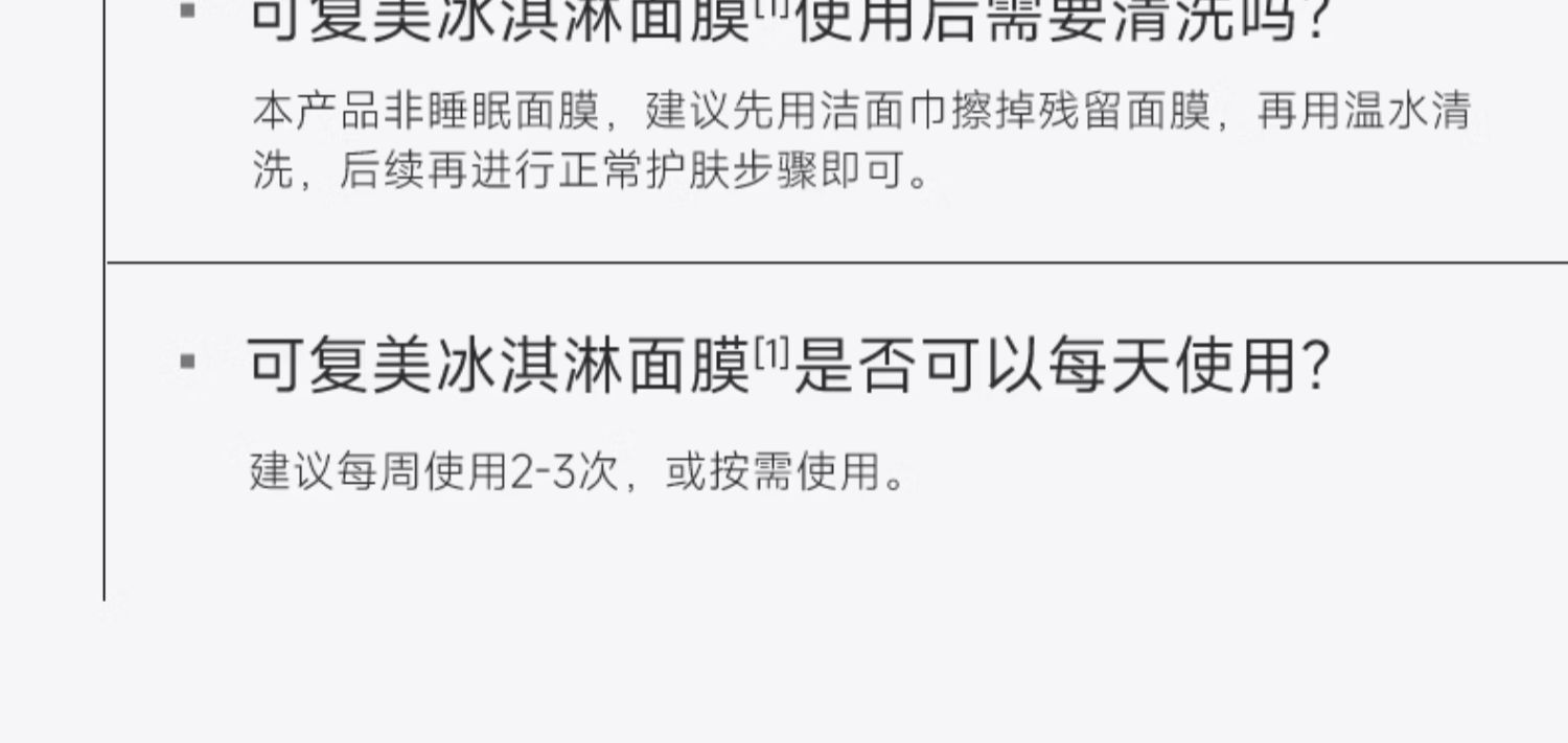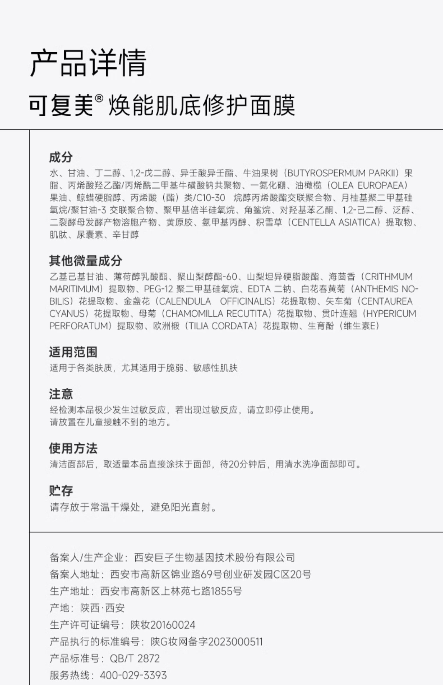 商品简介:【下单赠可复美大水膜25g*1片】可复美升级版冰淇淋面膜,敏感肌的救星!改善起皮泛红、修复受损角质层、促进创面愈合与皮肤修复,不含任何激素成分,起到补水保湿修复效果!特别好用,盘他就对了!