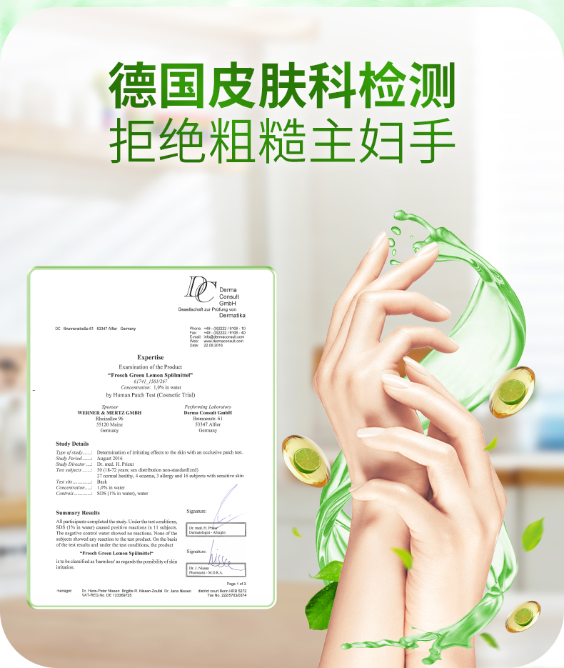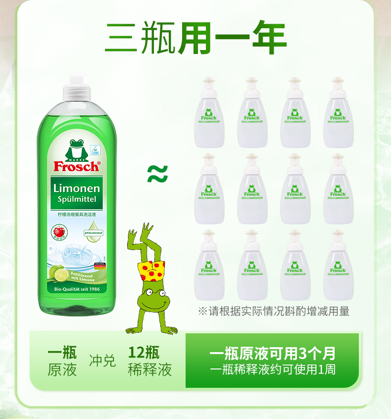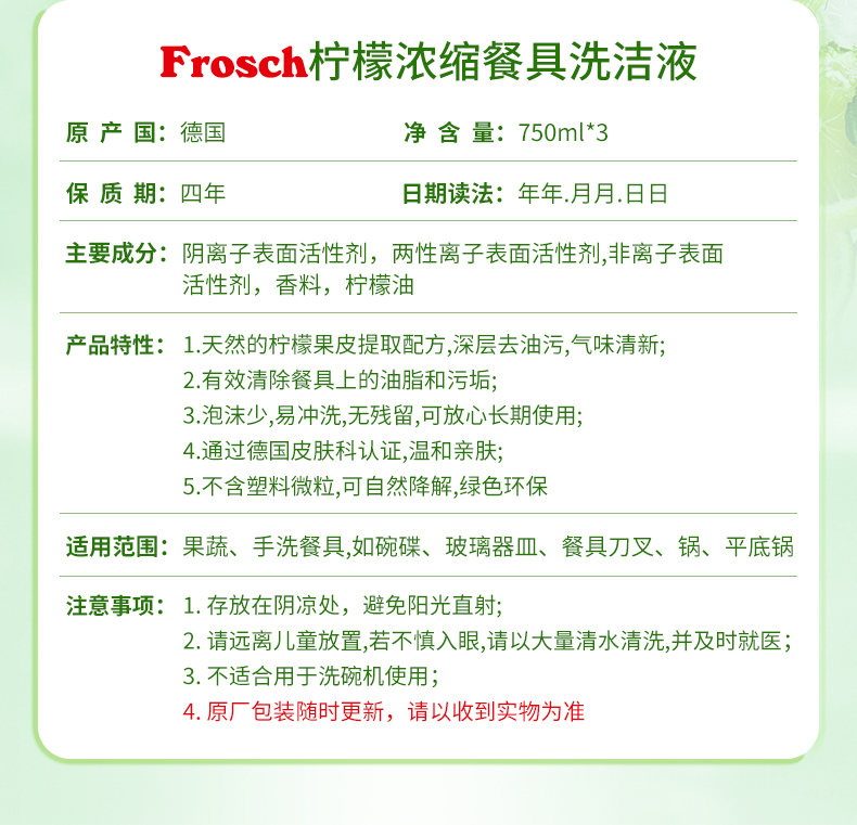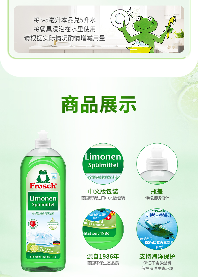 商品简介:德国进口Frosch洗洁精!三瓶750ML家庭装,可用一年,天然柠檬果提取,浓缩无残留,温和不伤手,洁净去油污,冷水可洗,浓缩型用量省!家务轻松做!