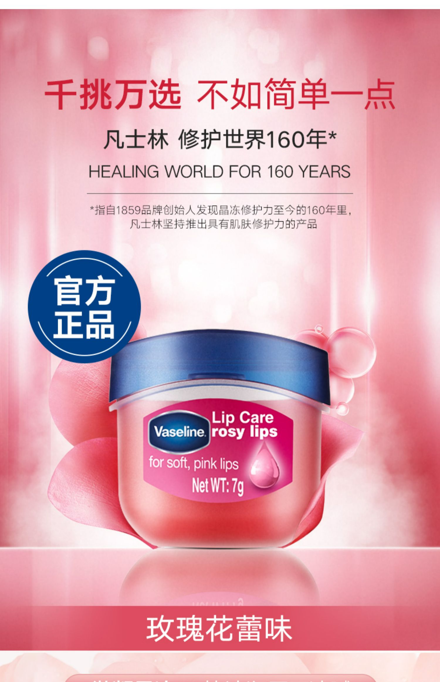 商品简介:凡士林官方旗舰店!持久自然水润唇色,改善干燥唇肌,解决唇部起皮,唇纹较深等唇部问题,粉润柔护,缔造娇美双唇保持双唇得秘密武器!
