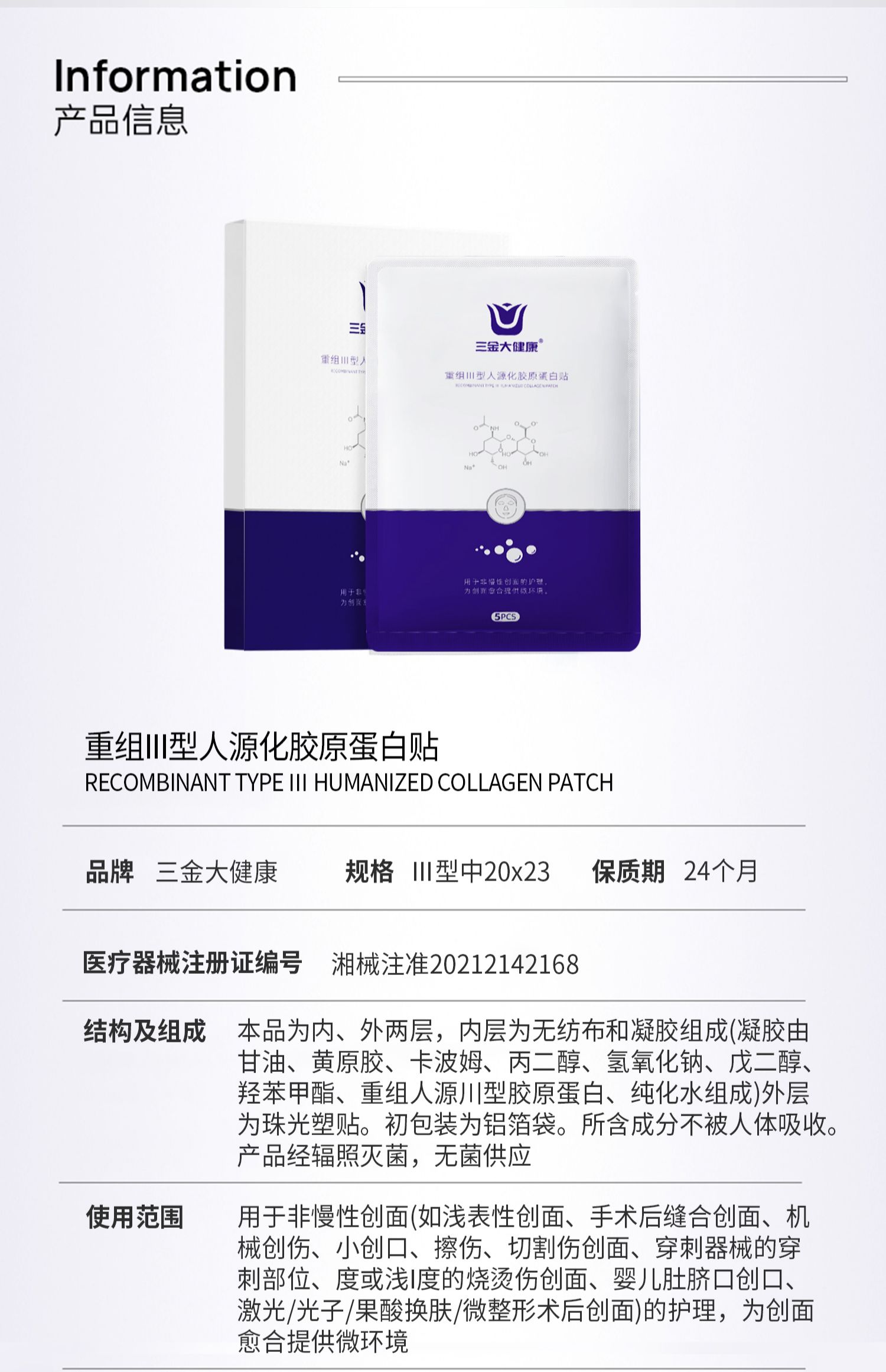 商品名称:三金大健康敷料医用非面膜修复医美补水修复重组III性胶原蛋白贴