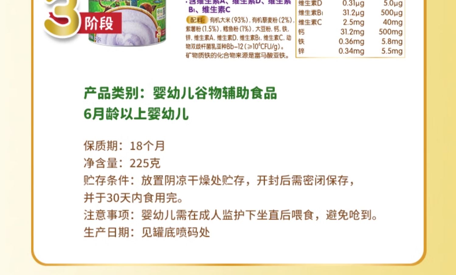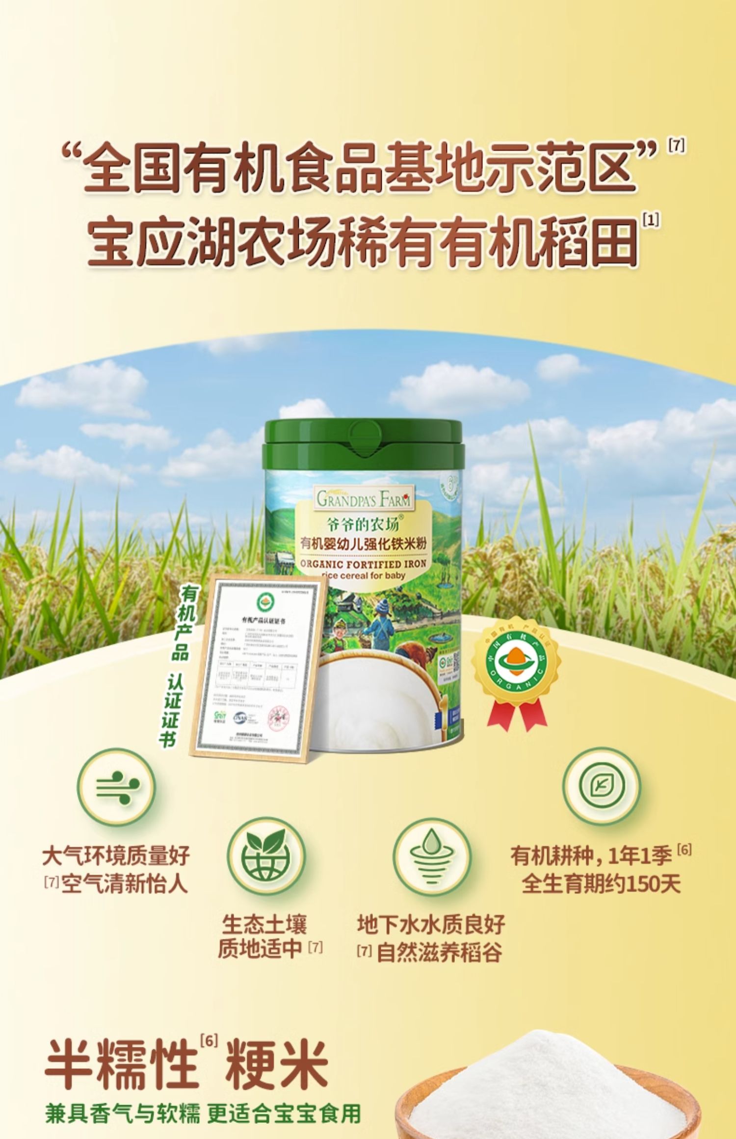 商品名称:爷爷的农场婴儿强化钙米粉宝宝婴幼儿高铁大米粉米糊营养辅食6月+