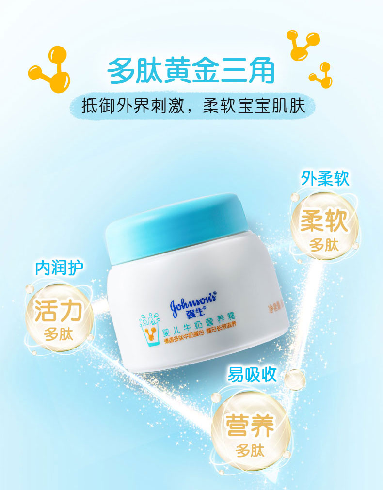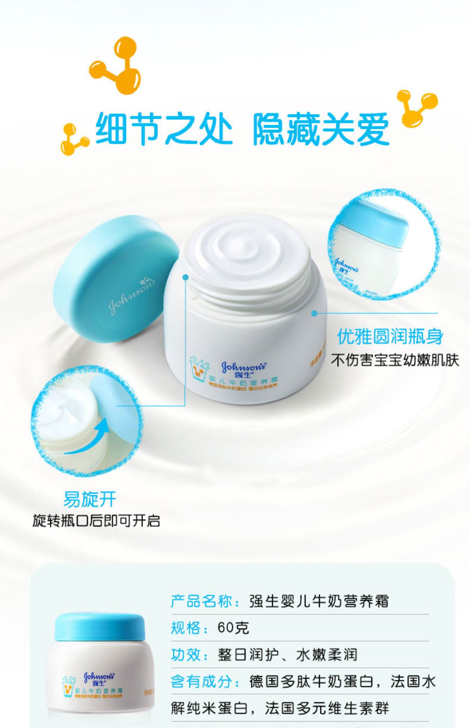商品简介:【1件8折,平台叠加300-40元,领劵到手30.4元】强生婴儿牛奶面霜儿童宝宝60g!多肽牛奶蛋白,淡淡牛奶清香,温和好吸收,24小时长效保湿,赶紧给宝宝安排起来哦