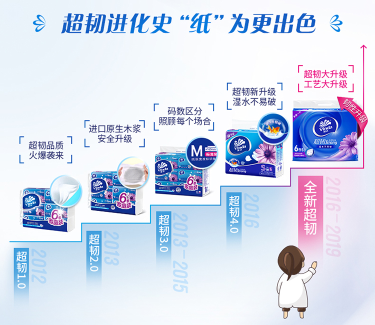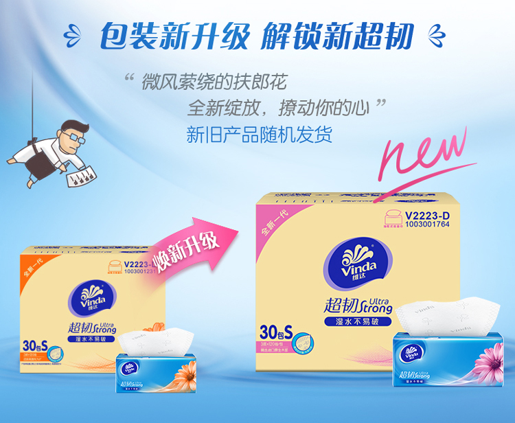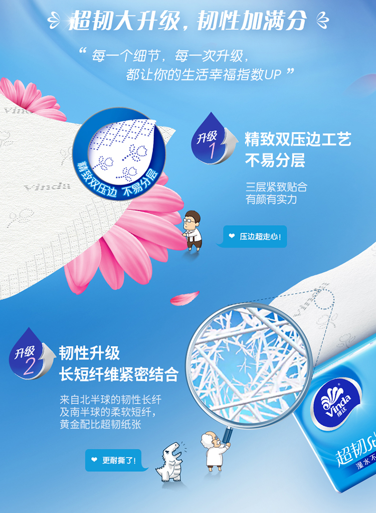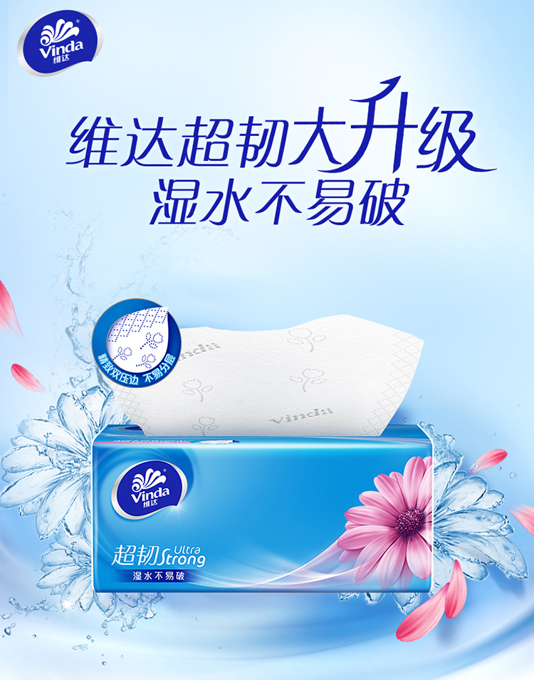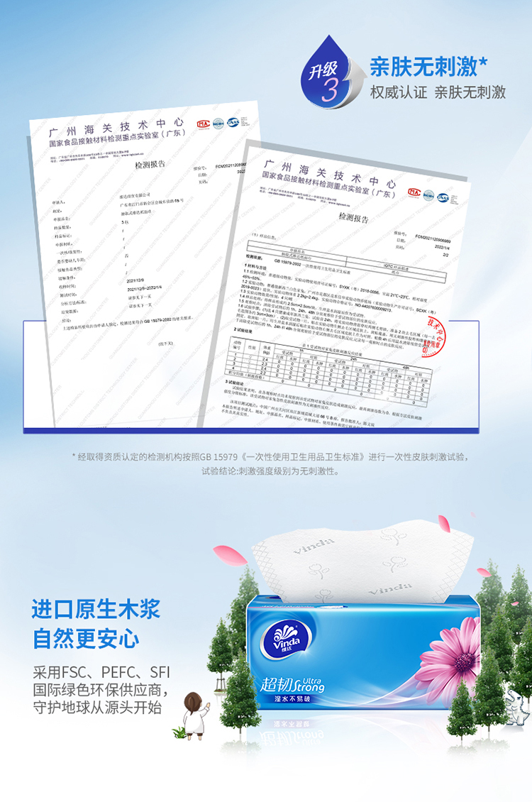 商品简介:【百亿31.4元】湿水不易破,精致双压边工艺,三层紧致贴合,有颜有实力,不含可迁移性荧光增白剂,温和无刺激~