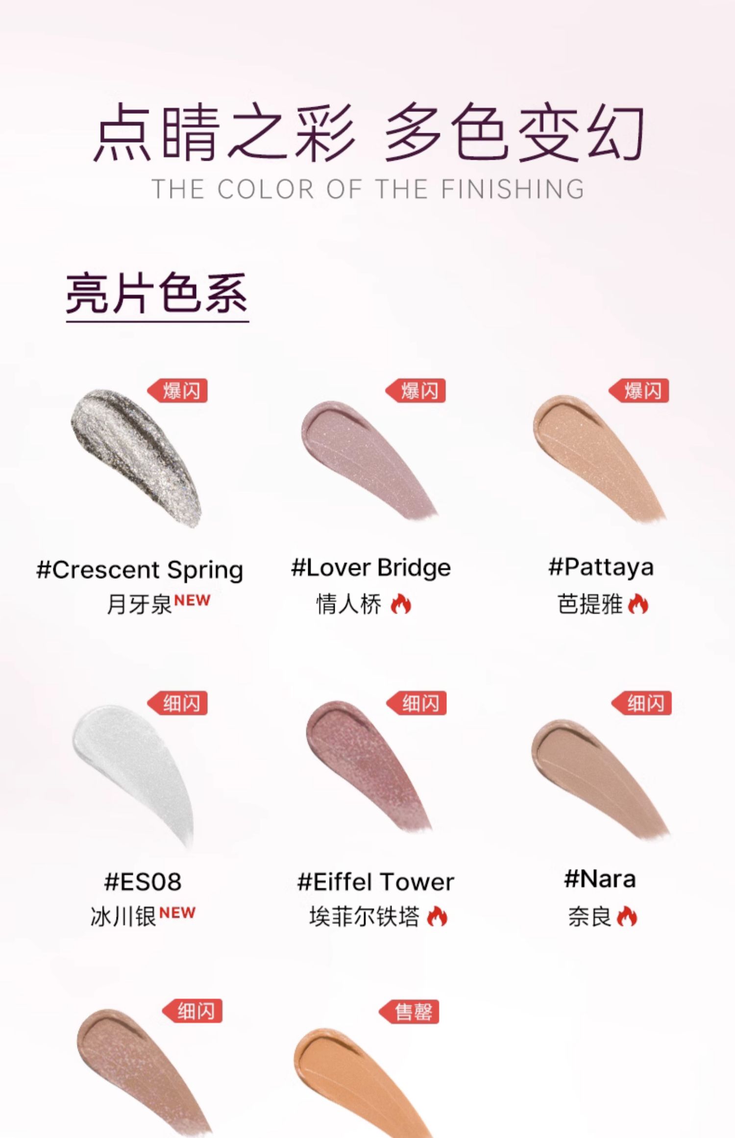 商品简介:轻薄贴肤,持妆特长,让你一整天拥有精致妆容,亮片细超闪粉珠光,防水卧蚕提亮,液滴泪妆,精巧上色,闪耀持妆~