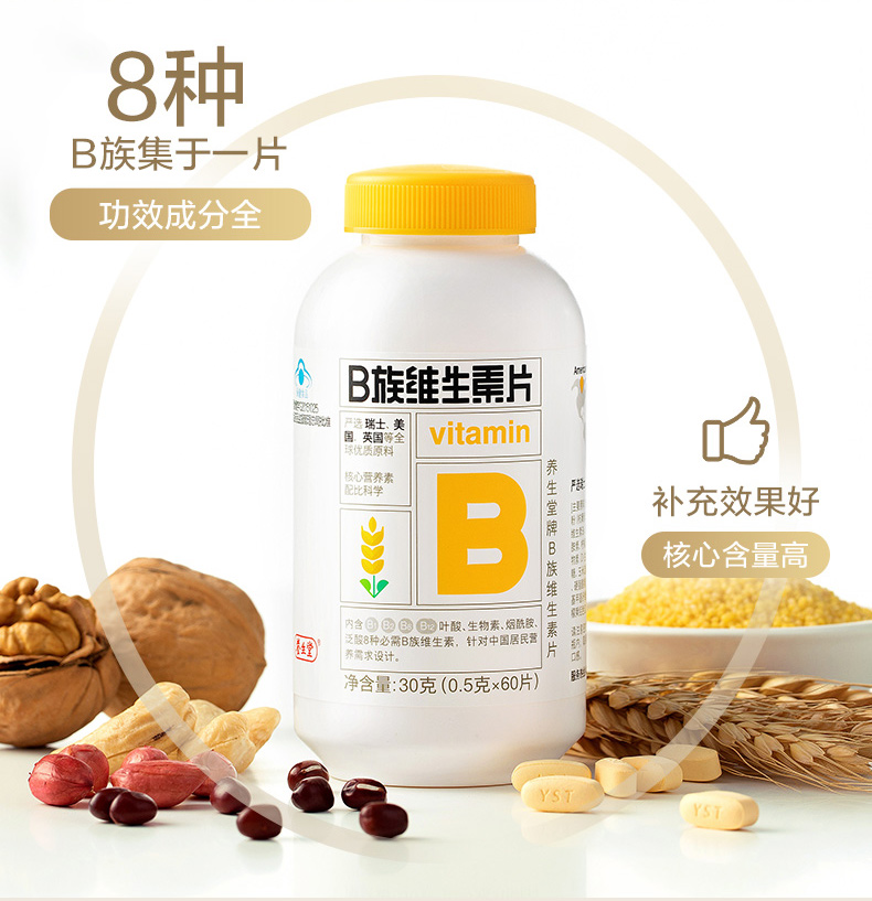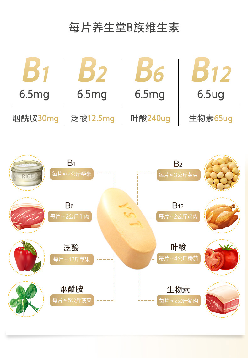 商品简介:复合维生素VB!1片补充8种B族维生素,每天一片补充每日所需维生素!关爱努力生活的你,加班,熬夜,喝酒常备!恢复好状态,精力常在线!