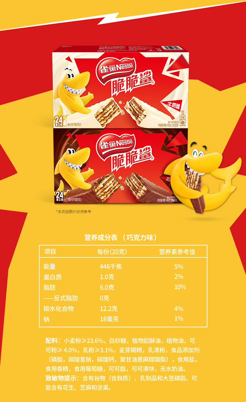 商品介绍:雀巢脆脆鲨巧克力味威化饼干446.4g*2盒