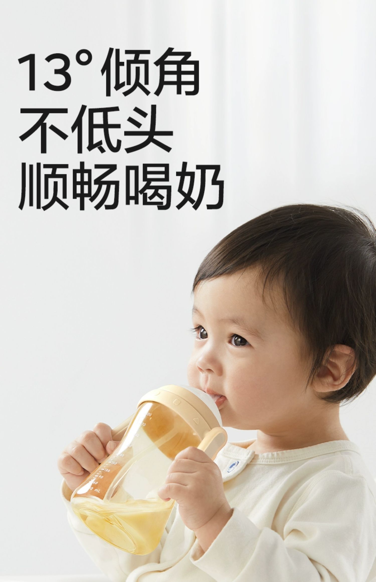 商品简介:宝宝学饮杯婴儿防胀气ppsu奶瓶,不低头,防呛护脊椎,13°倾角呵护颈椎,奶嘴/吸管轻松过渡。