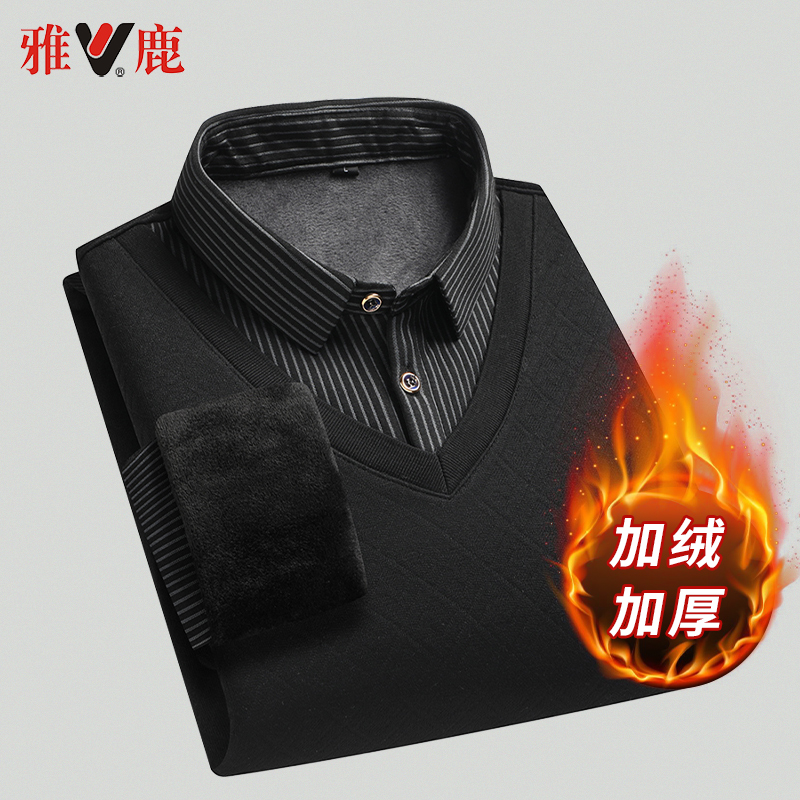 商品简介:雅鹿加绒加厚毛衣男假两件爸爸冬装针织打底衫一体绒男士保暖衣服。