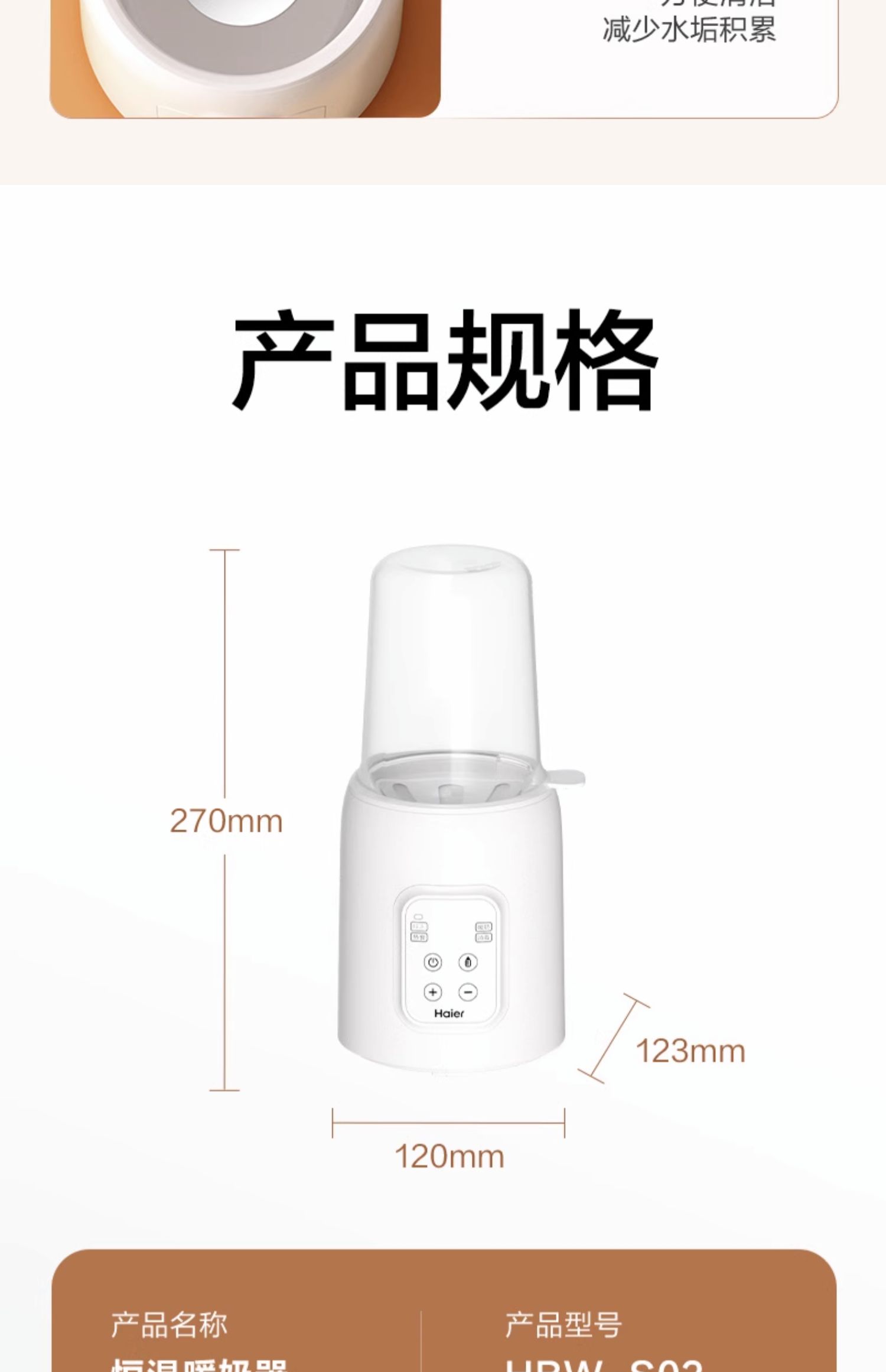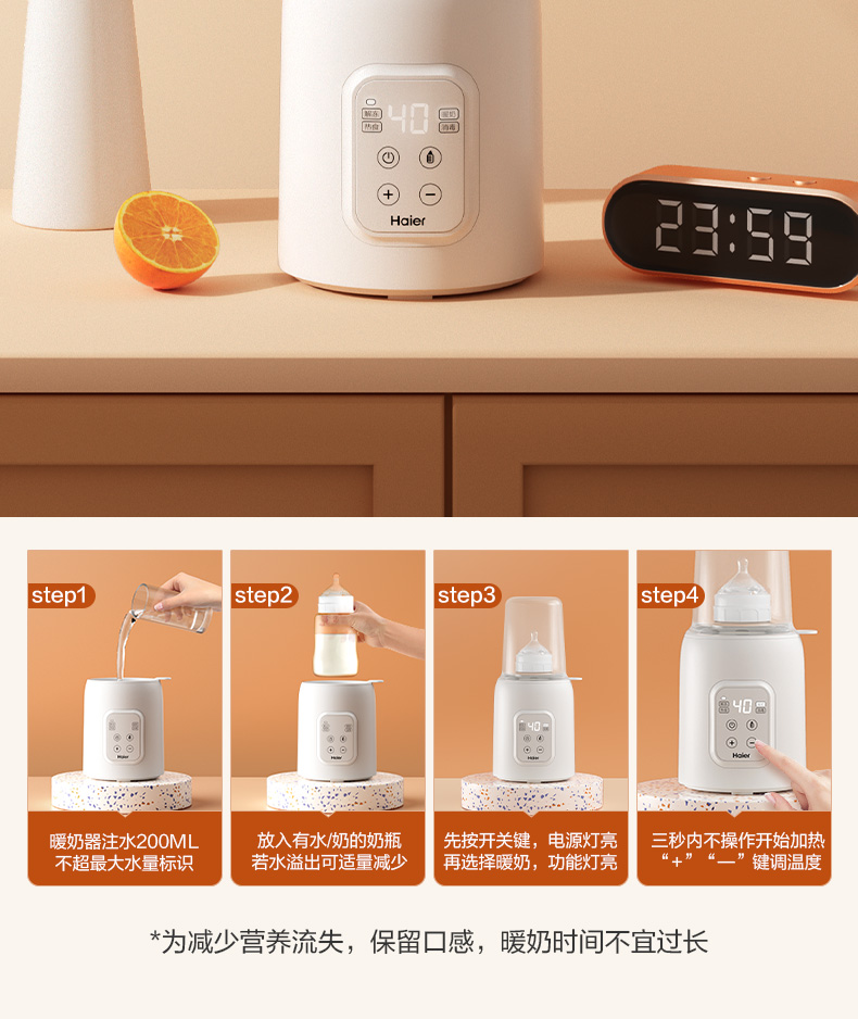 商品简介:海尔智能恒温奶器,自动恒温奶瓶消毒器二合一,24小时恒温暖奶,旋钮控制,温和解冻,加热辅食,加热消毒,准确温控,温度可调节,食品级PP,安全无味,宝宝喝奶方便,妈妈放心