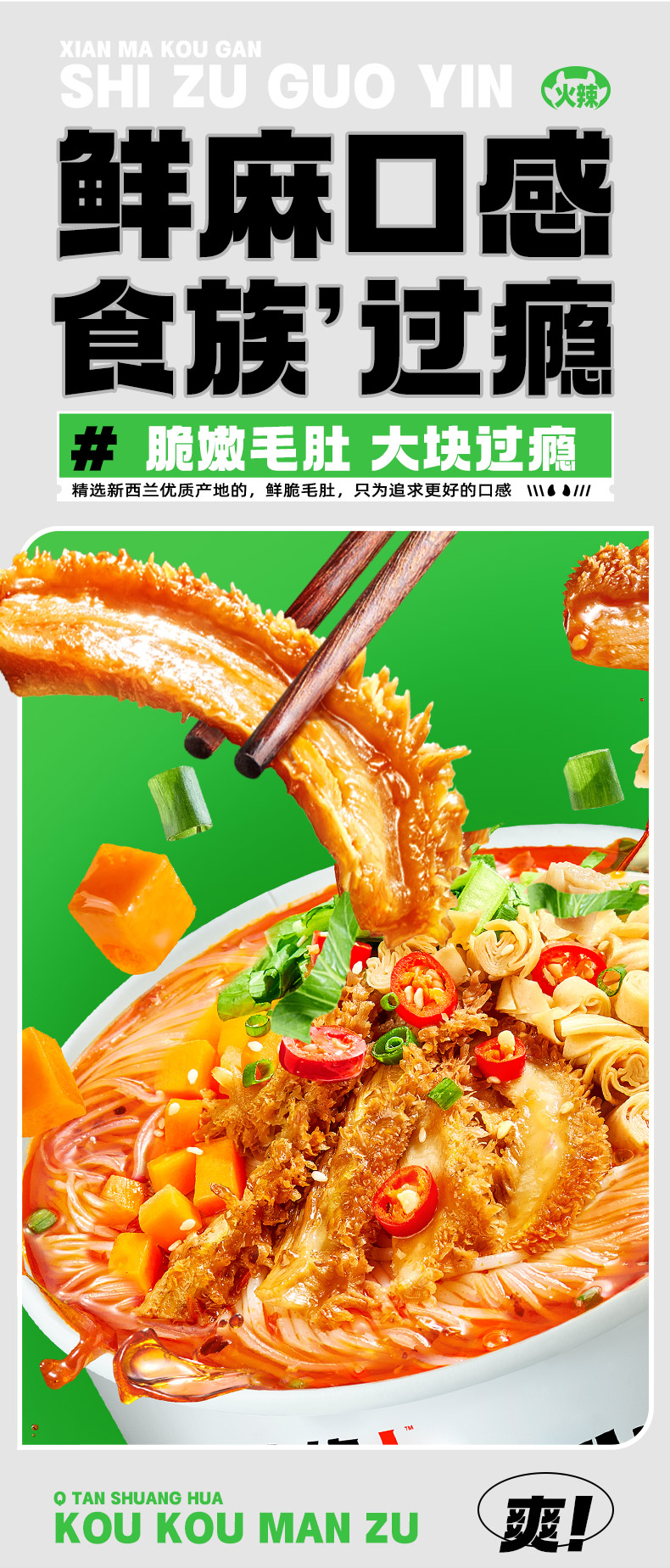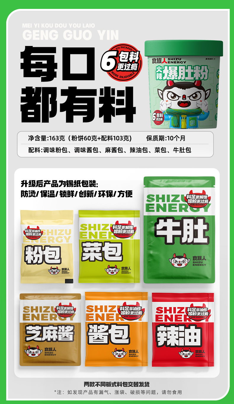 商品简介:【反5猫超卡】食族人加倍香辣爆肚粉,用料十足!!163g*6桶大分量,给你全新的嗦粉体验,看得见的真材实料!滑嫩口~口感细腻,丝丝入味!吃了还想吃,汤都要喝干~