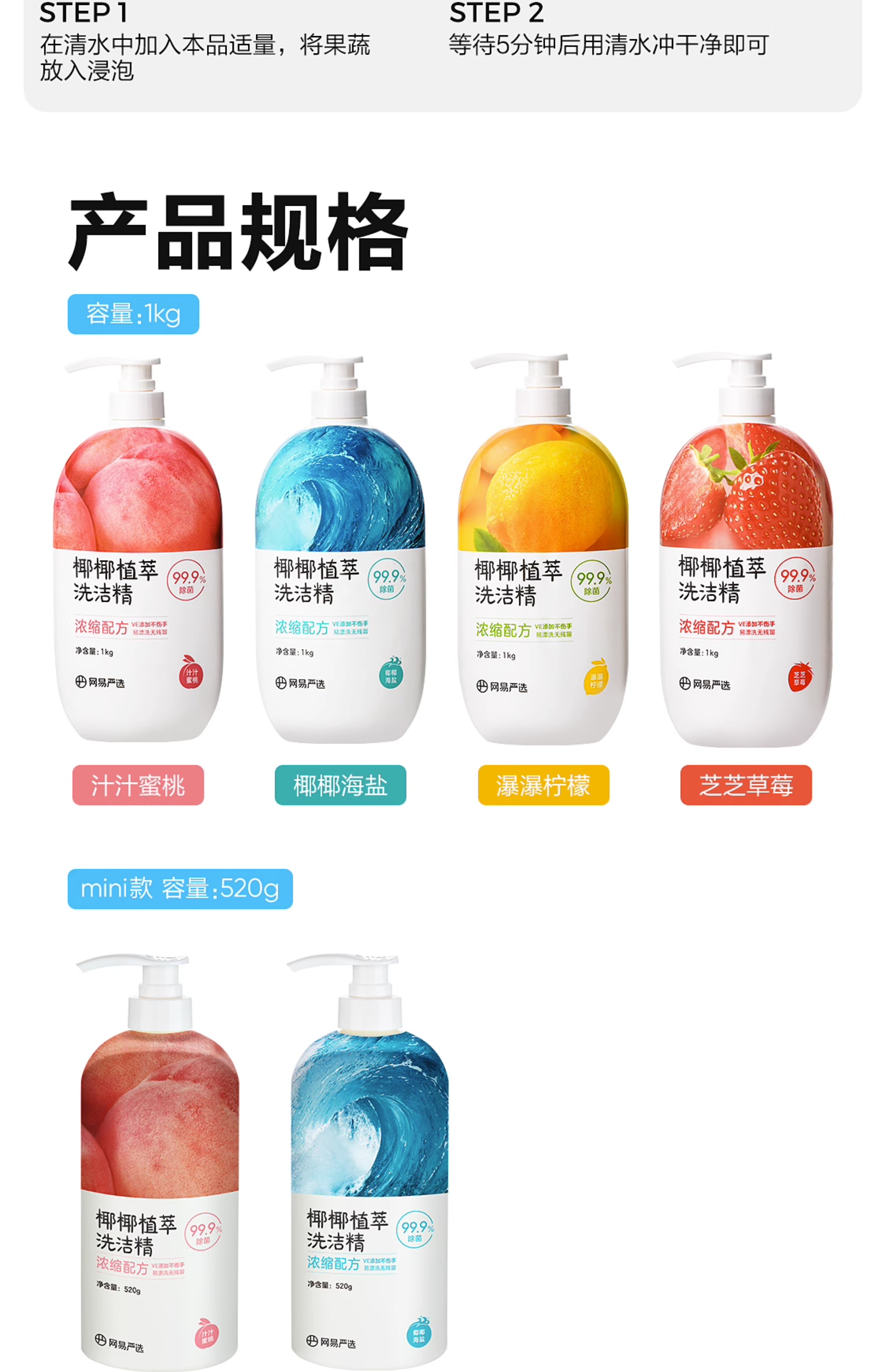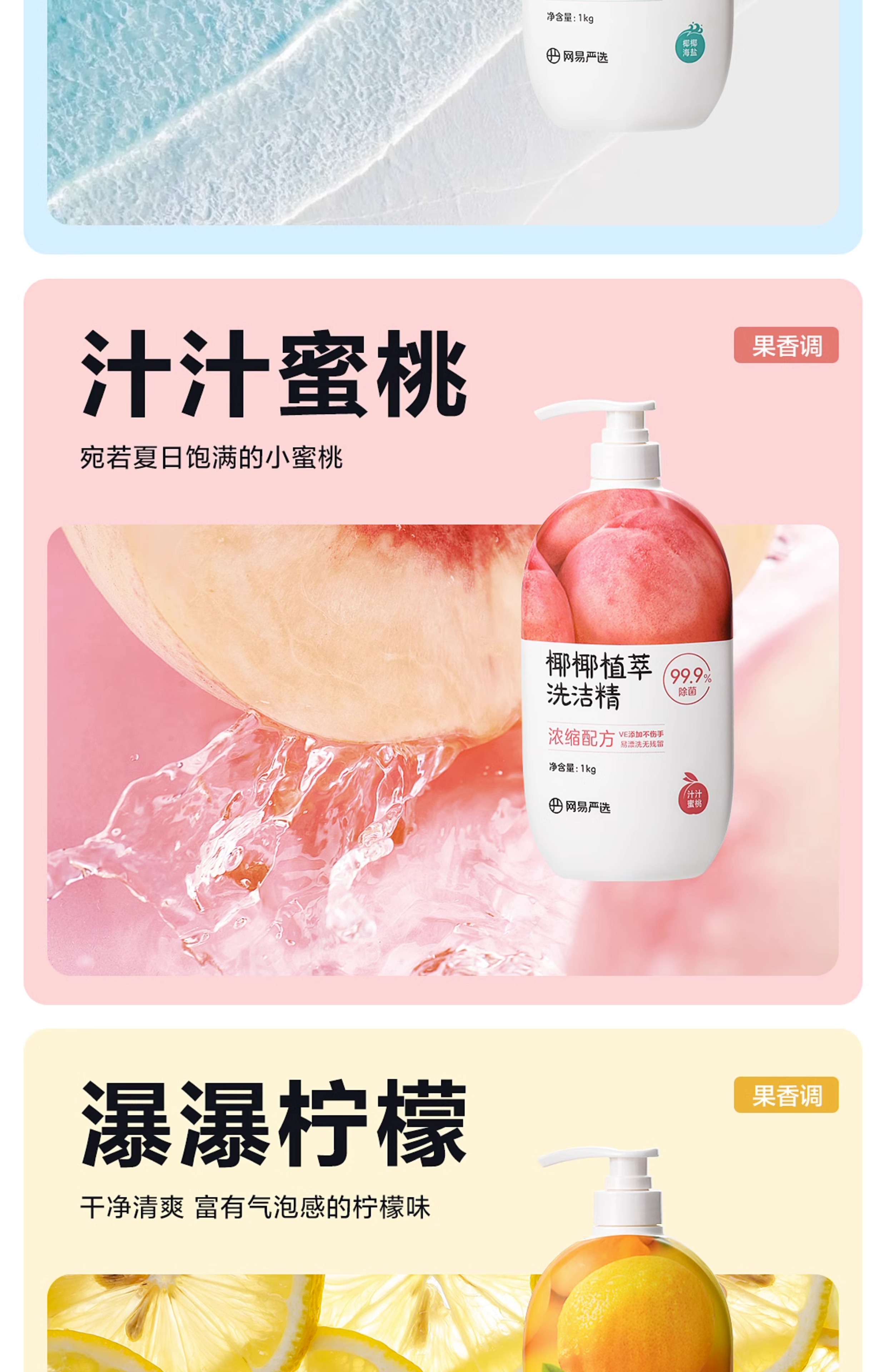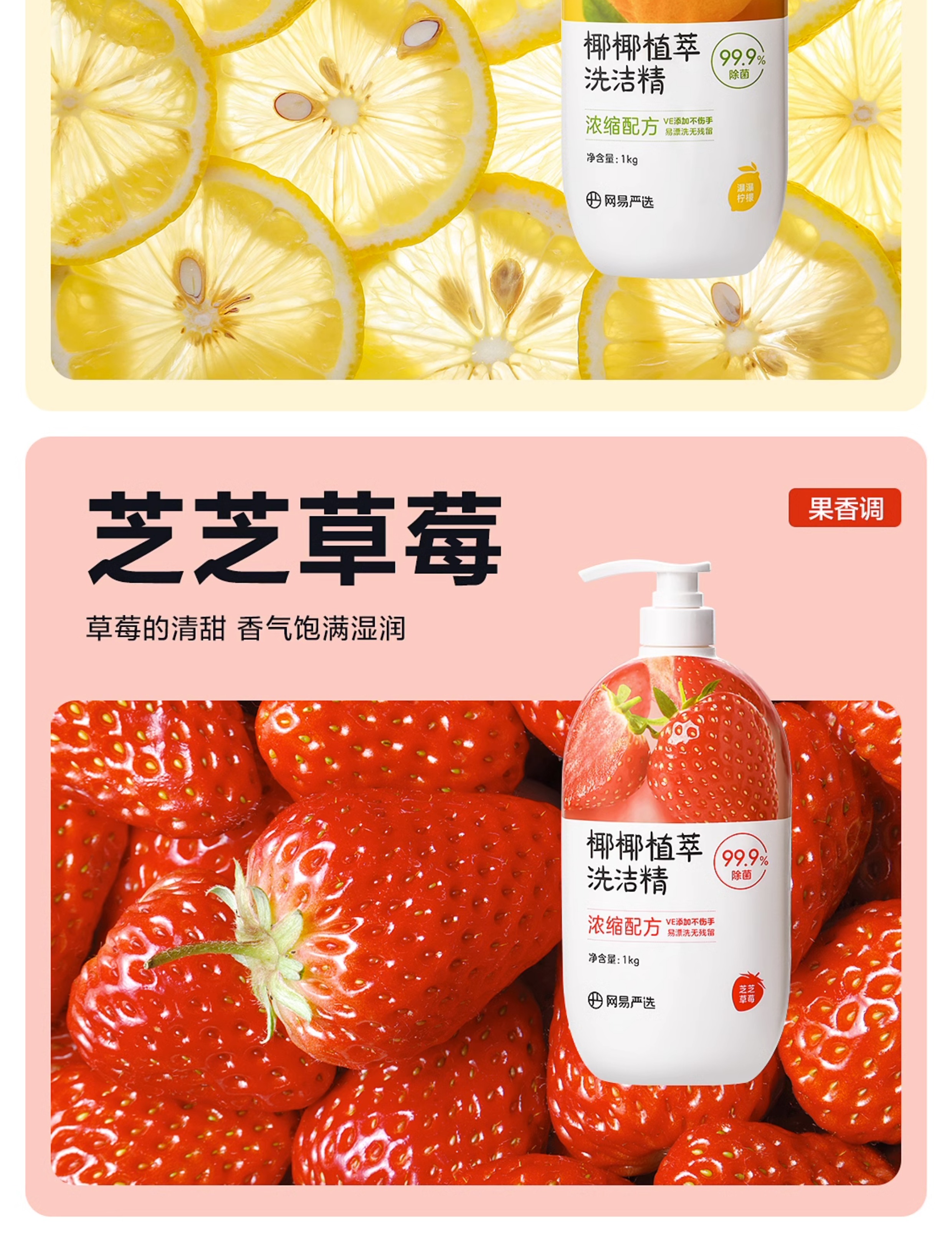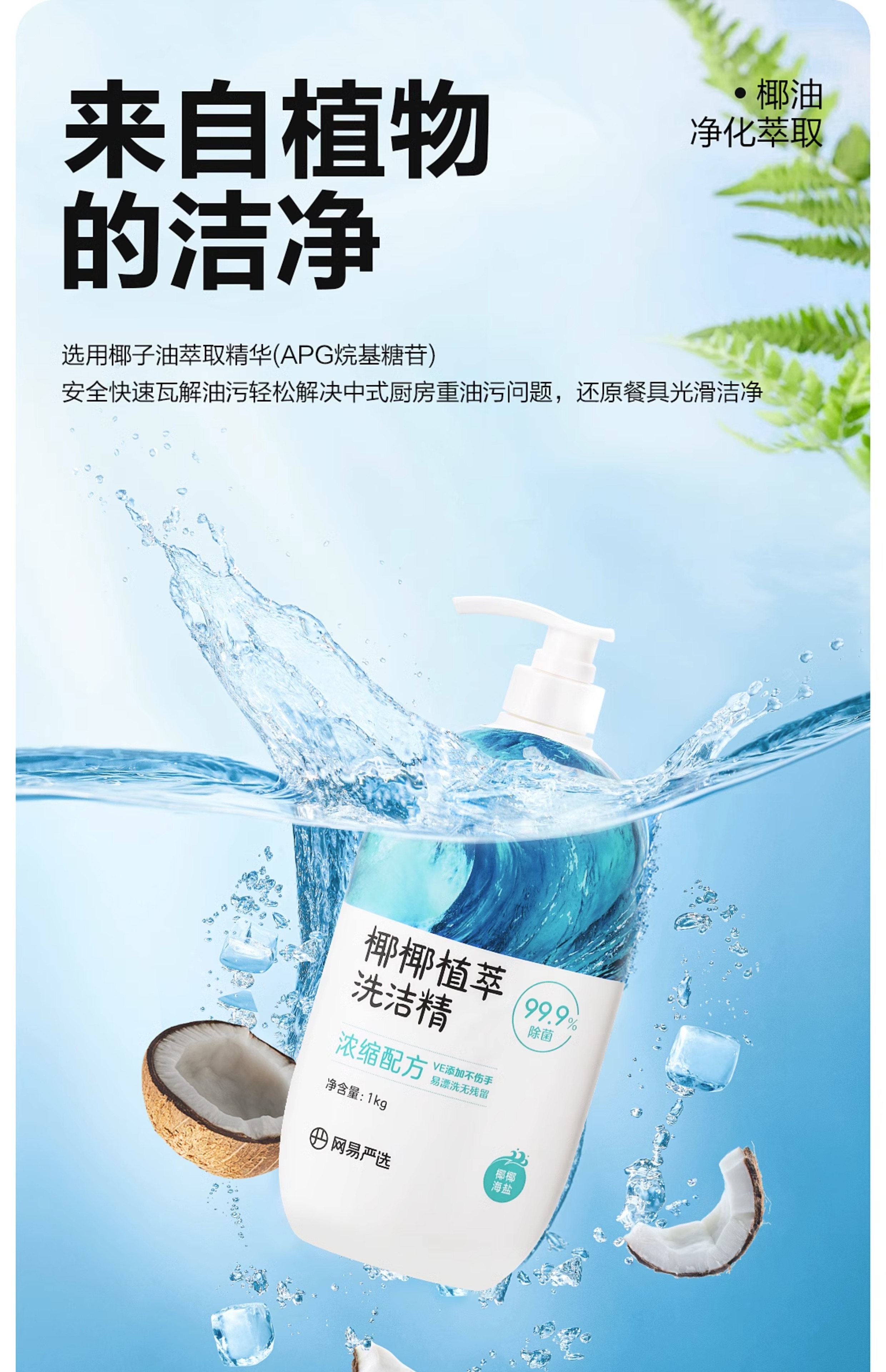 商品名称:网易严选椰椰植萃洗洁精家用食品级按不伤手可洗果蔬去油谷物精华