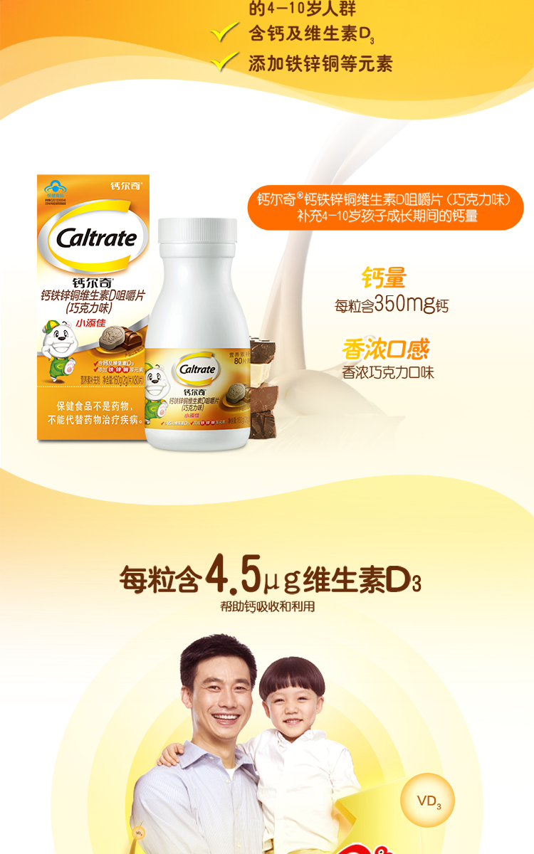 商品名称:钙尔奇小添佳咀嚼片(巧克力味)80片宝宝儿童青少年维生素D3补钙