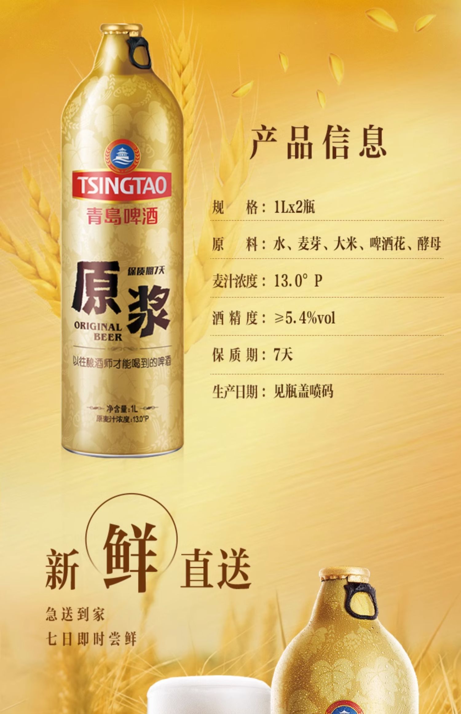 商品简介:【下单送肖战明信片一张或扎杯1个,拍2送瑶瑶立牌一个+扎杯1个,拍3送代言人台历一份】青岛原浆新鲜直送,活性酵母,纯正鲜醇,精选优质麦芽,高端宴请,家庭聚会,走亲访友!