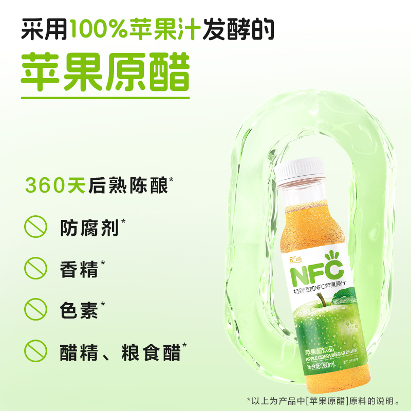 商品简介:【立减25元,88vip到手280ml*10瓶仅66.5】优选品质好果,特别添加NFC苹果原汁,口感更佳的苹果醋,果汁含量百分百,清新自然,果香浓郁!0脂轻负担,每天1瓶,轻盈每刻!