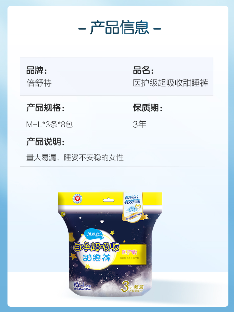 商品简介:【凑满减到手约58元】倍舒特医护级8小时抑菌*超弹高腰防漏安睡裤,四重防护,量大吸收到天亮,通过权威认证,敏感肌也可安心使用哦~