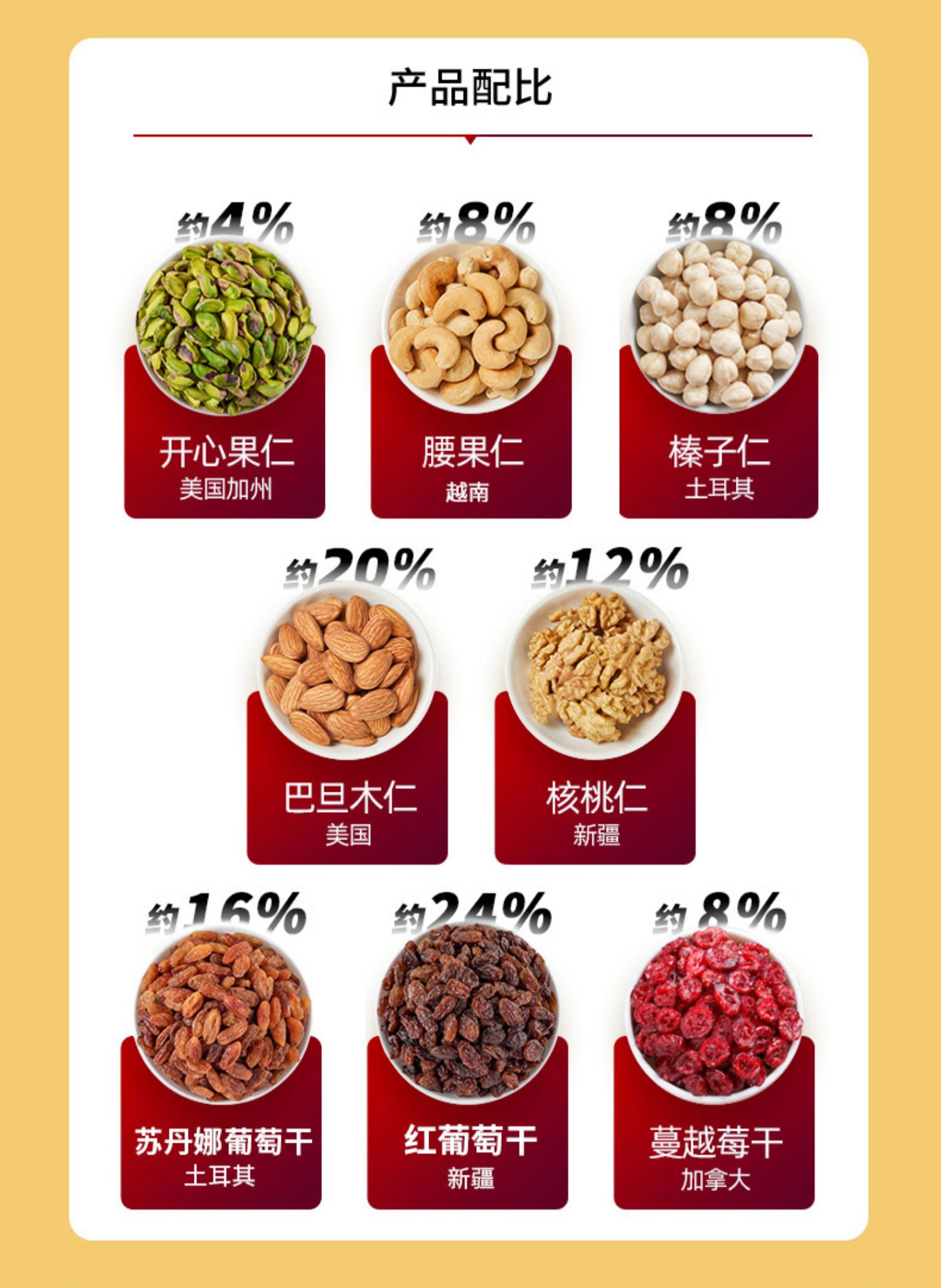 商品简介:经典搭配,甄选全球优质坚果,科学营养配比,颗颗饱满鲜润果肉,充满着森林气息,干湿分区,锁住新鲜,开袋即享美味之旅。【赠运费险】