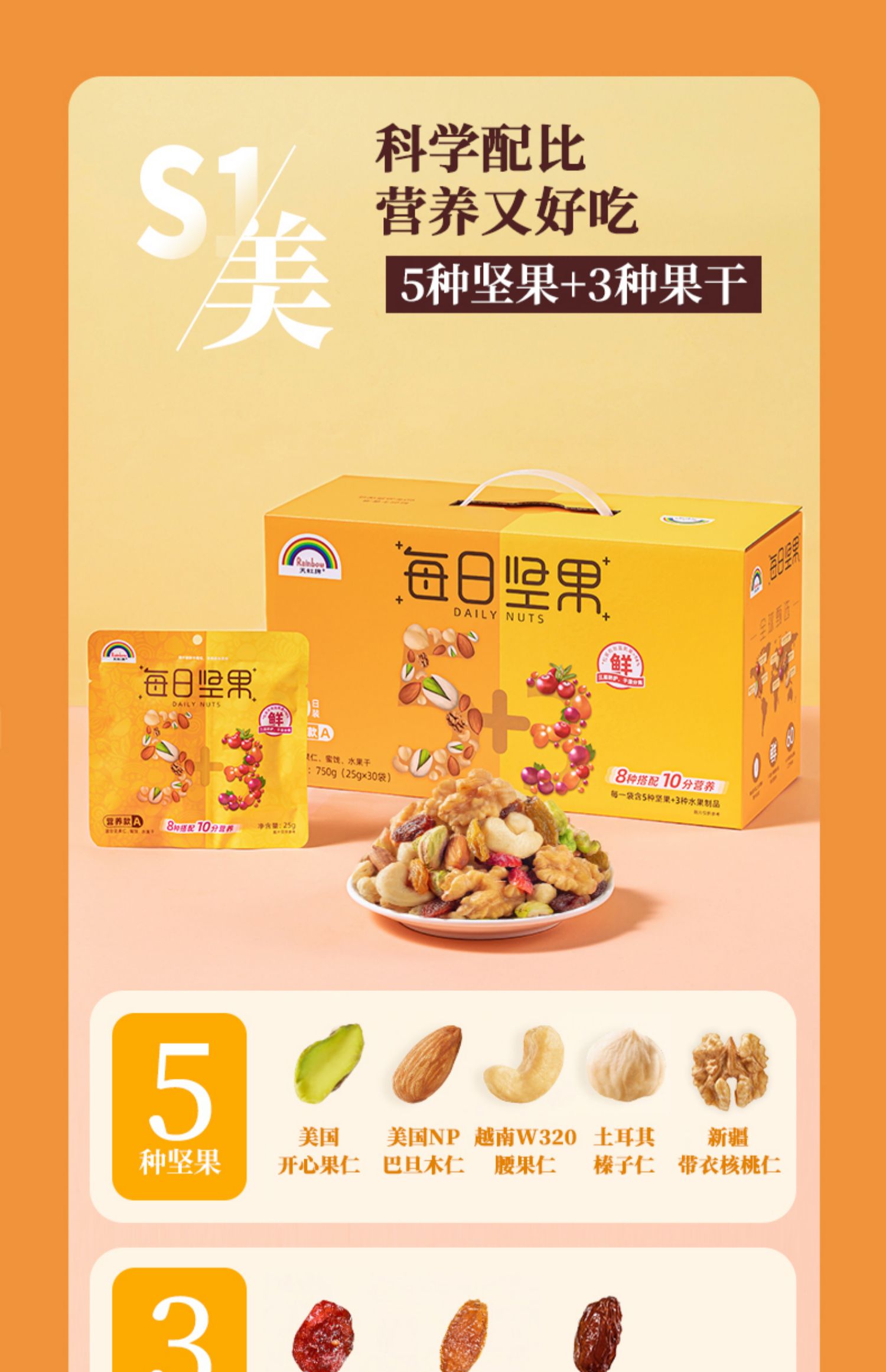 商品名称:天虹牌每日坚果750g 营养混合坚果礼盒孕妇独立包装休闲零食送礼