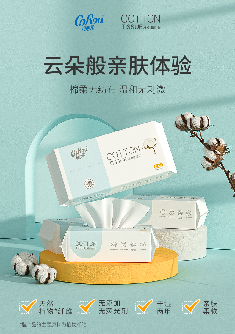 商品名称:可心柔婴儿植物绵柔巾新生儿干湿两用洗脸巾加厚绵柔巾60抽4包