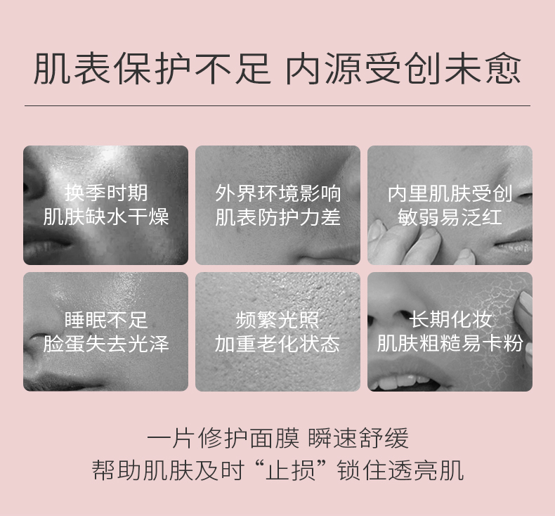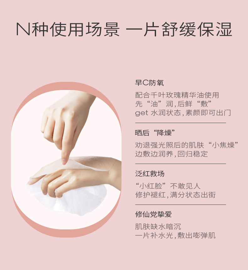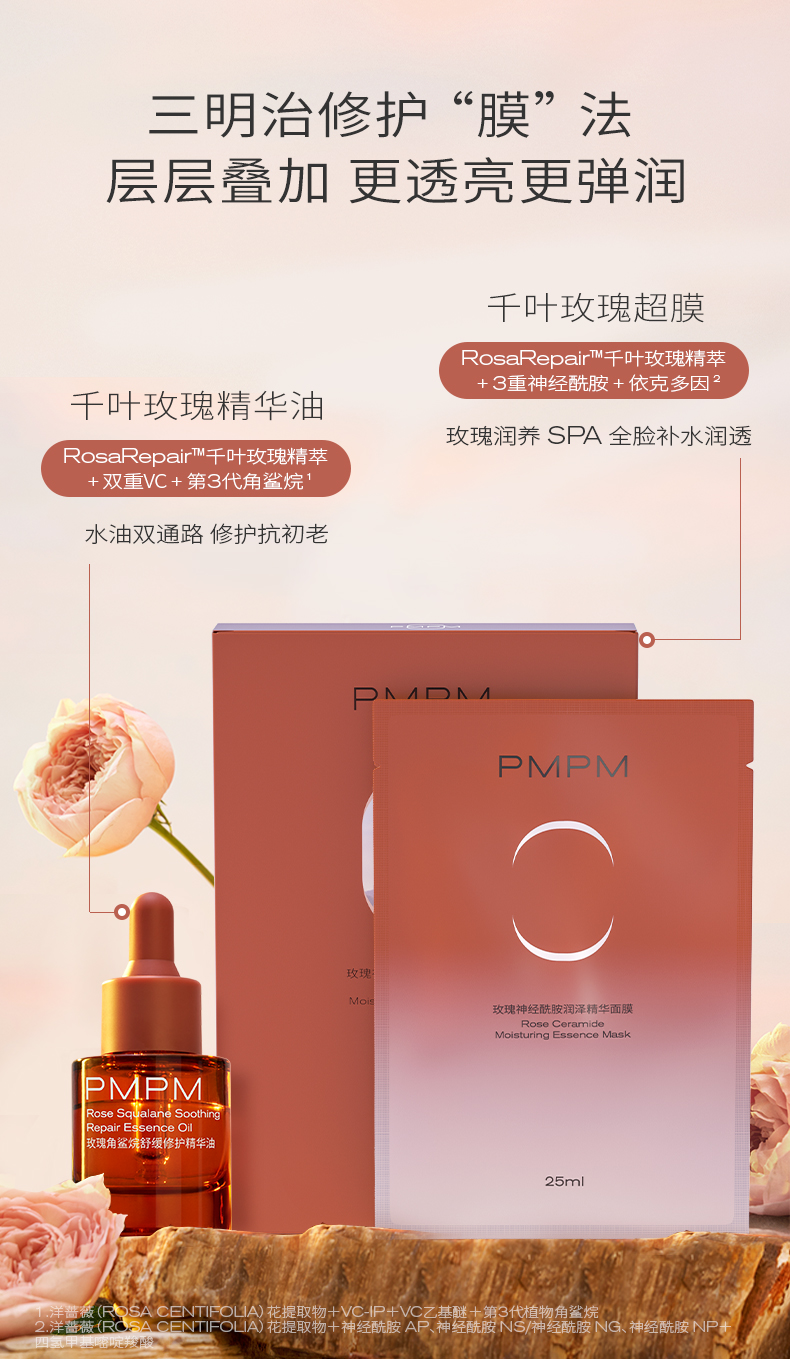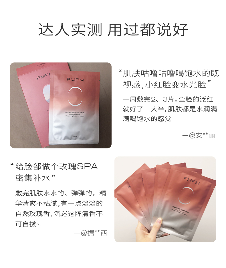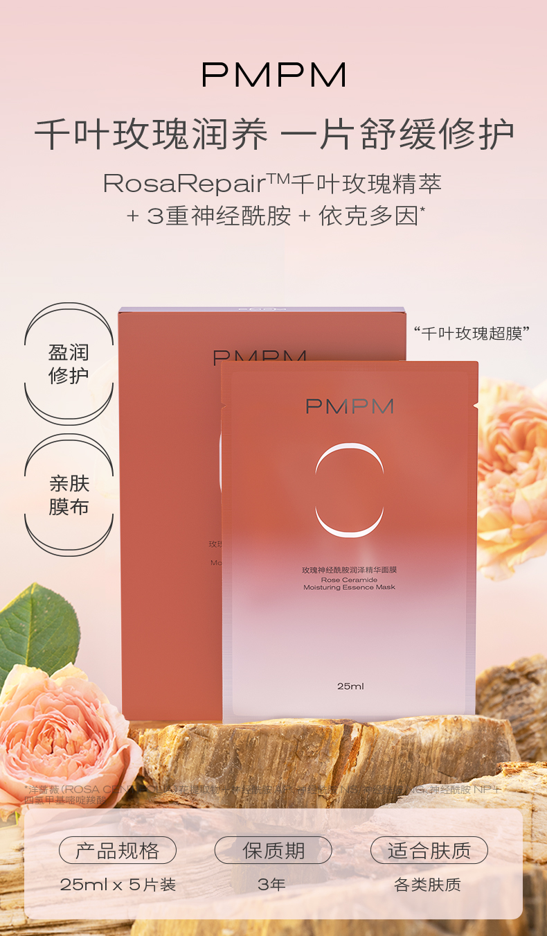 商品简介:PMPM知名品牌,国货精品,千叶玫瑰精粹+3重神经酰胺+依克多因,莹润修护舒缓面膜!超薄天丝膜布,吸收更好,敏感肌可用!持久补水保湿,皮肤嫩出水!