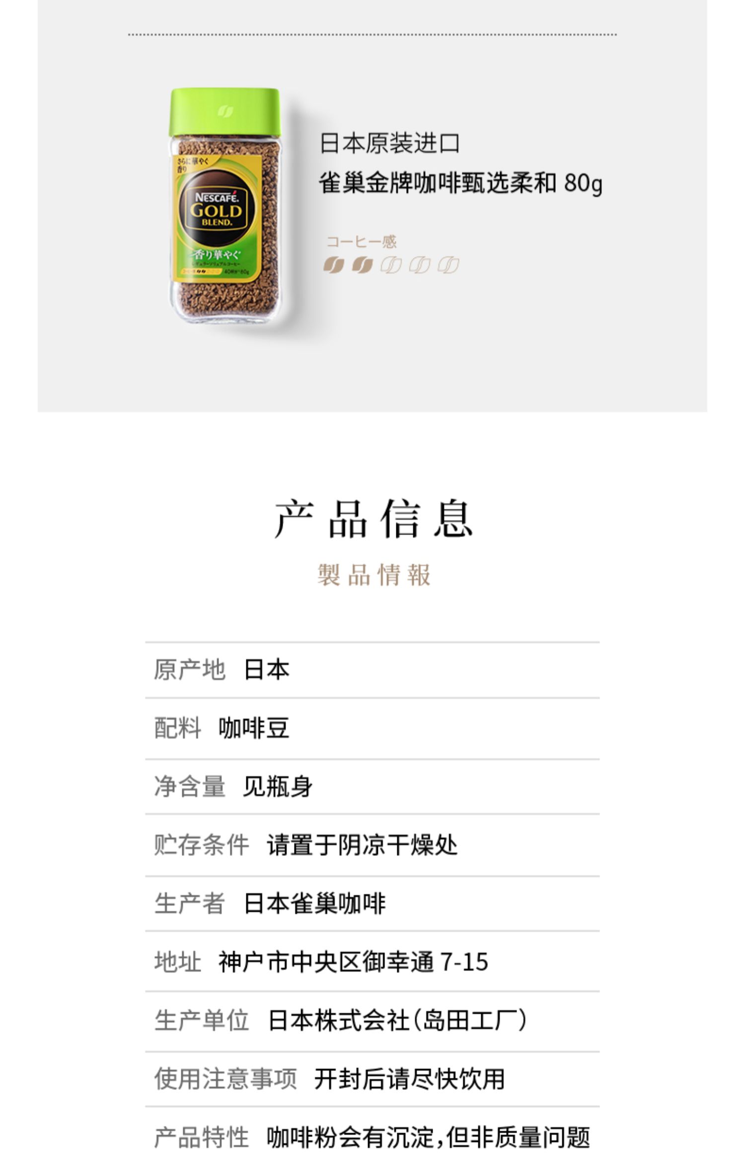 商品介绍:临期特惠!雀巢金牌咖啡80g