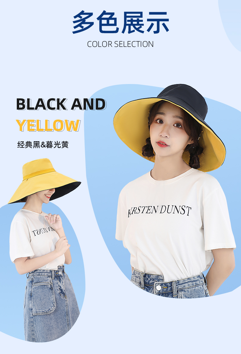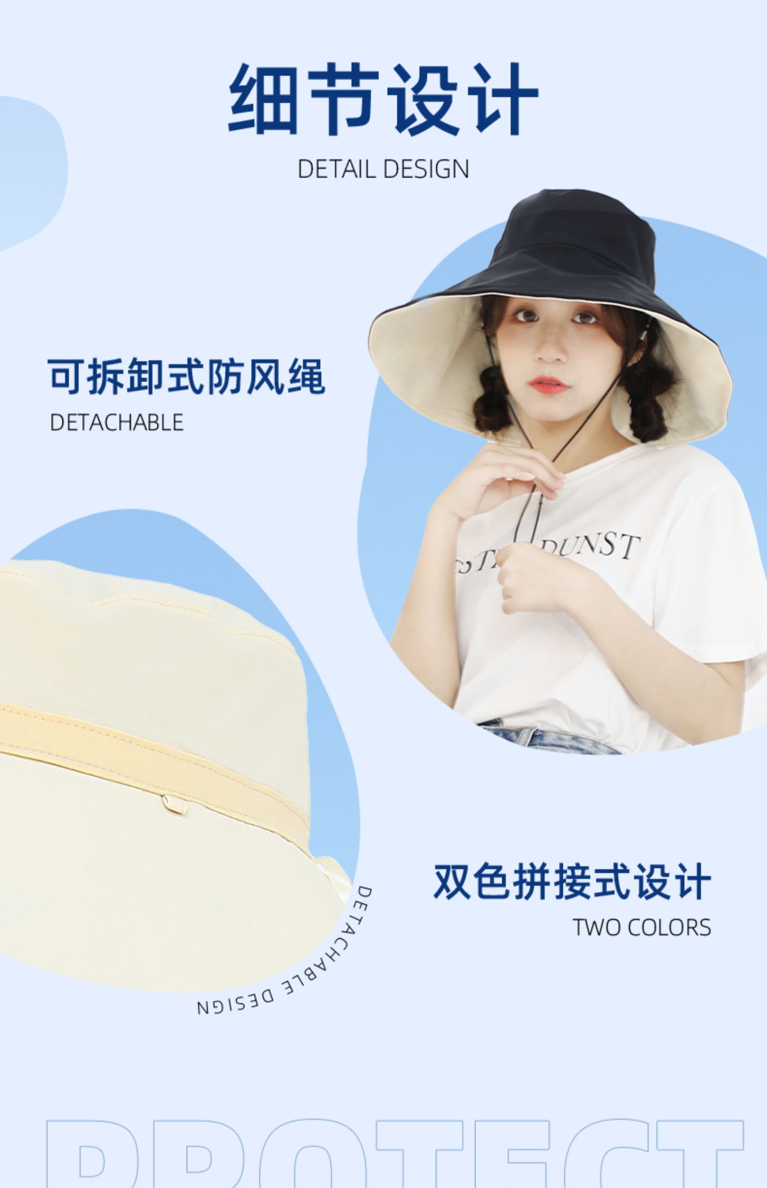 商品简介:双面可戴渔夫帽,透气不闷热,UPF50专业防晒,可以有效阻隔紫外线,加大帽檐,加大防护,头面颈一体防晒,帽檐还可以随意凹造型~