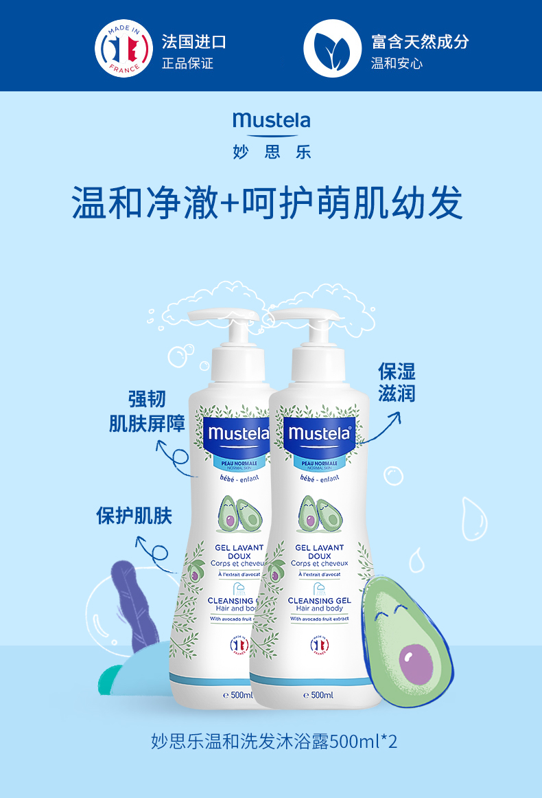 商品名称:【自营】妙思乐Mustela进口婴儿洗发沐浴露500ml*2保湿温和洁净
