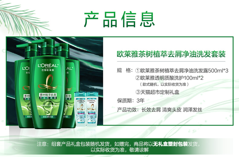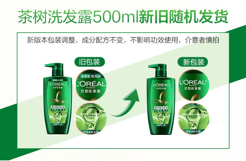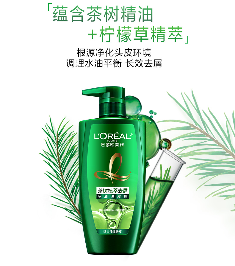 商品名称:欧莱雅绿瓶茶树植萃去头屑控油男女洗发水露持久留香套装官方正品