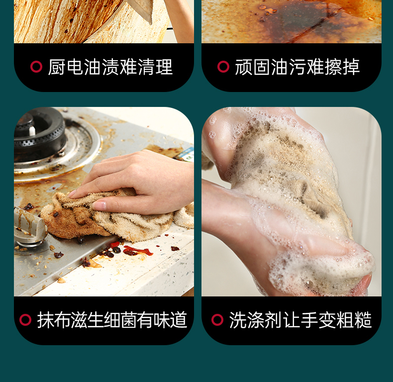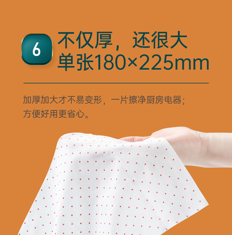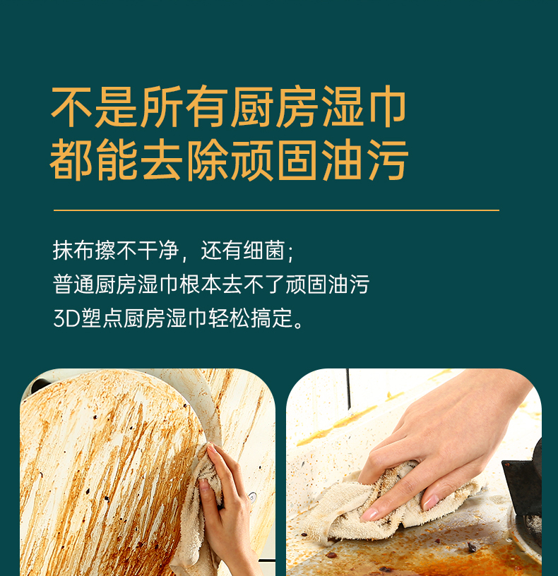 商品简介:【单包仅9.97亓!单抽0.31亓】独立3D立体塑点,10倍摩擦去油污,加大加厚强效去除油污,不含酒精,温和不伤手,防止细菌滋生,有效清除异味,吸油锁油,一擦即净~
