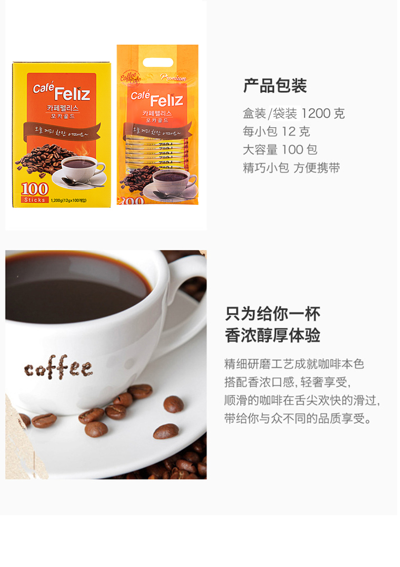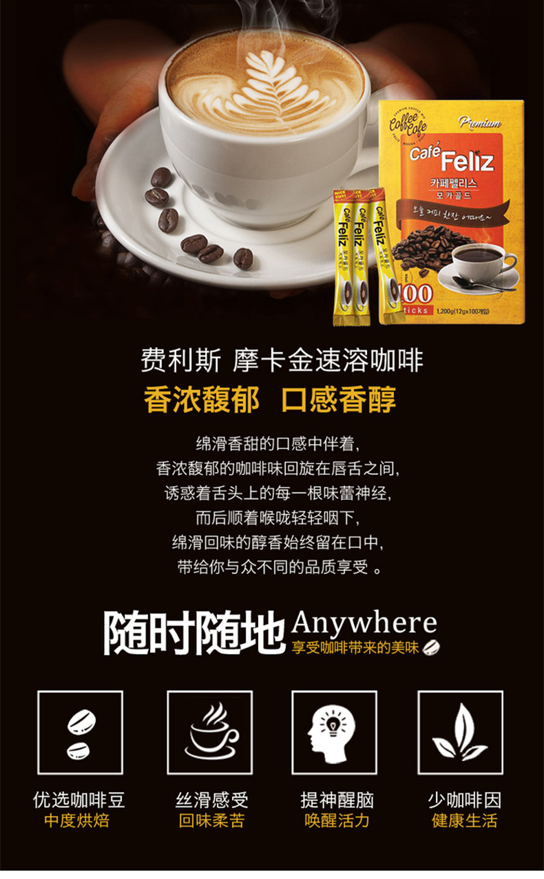 商品名称:【自营】【100条量贩装】feliz费利斯韩国摩卡金速溶咖啡提神醒脑