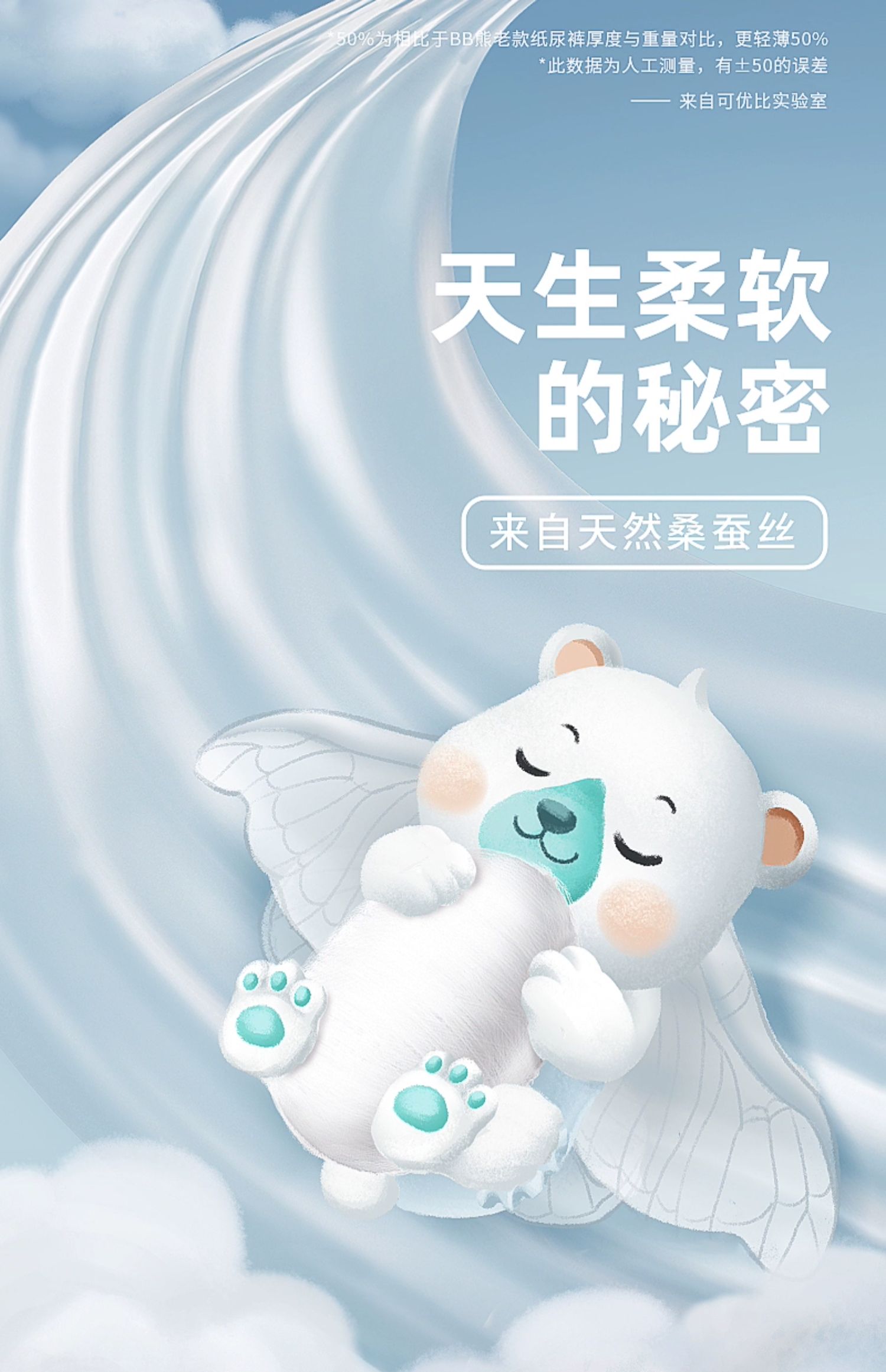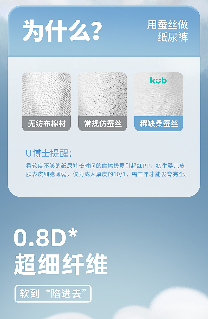 商品简介:可优比旗舰店,添加天然蚕丝~纸尿裤柔软度天花板!瞬间干爽不回渗,大量吸收,只需一片。云朵般的触感,让宝宝告别红屁屁!