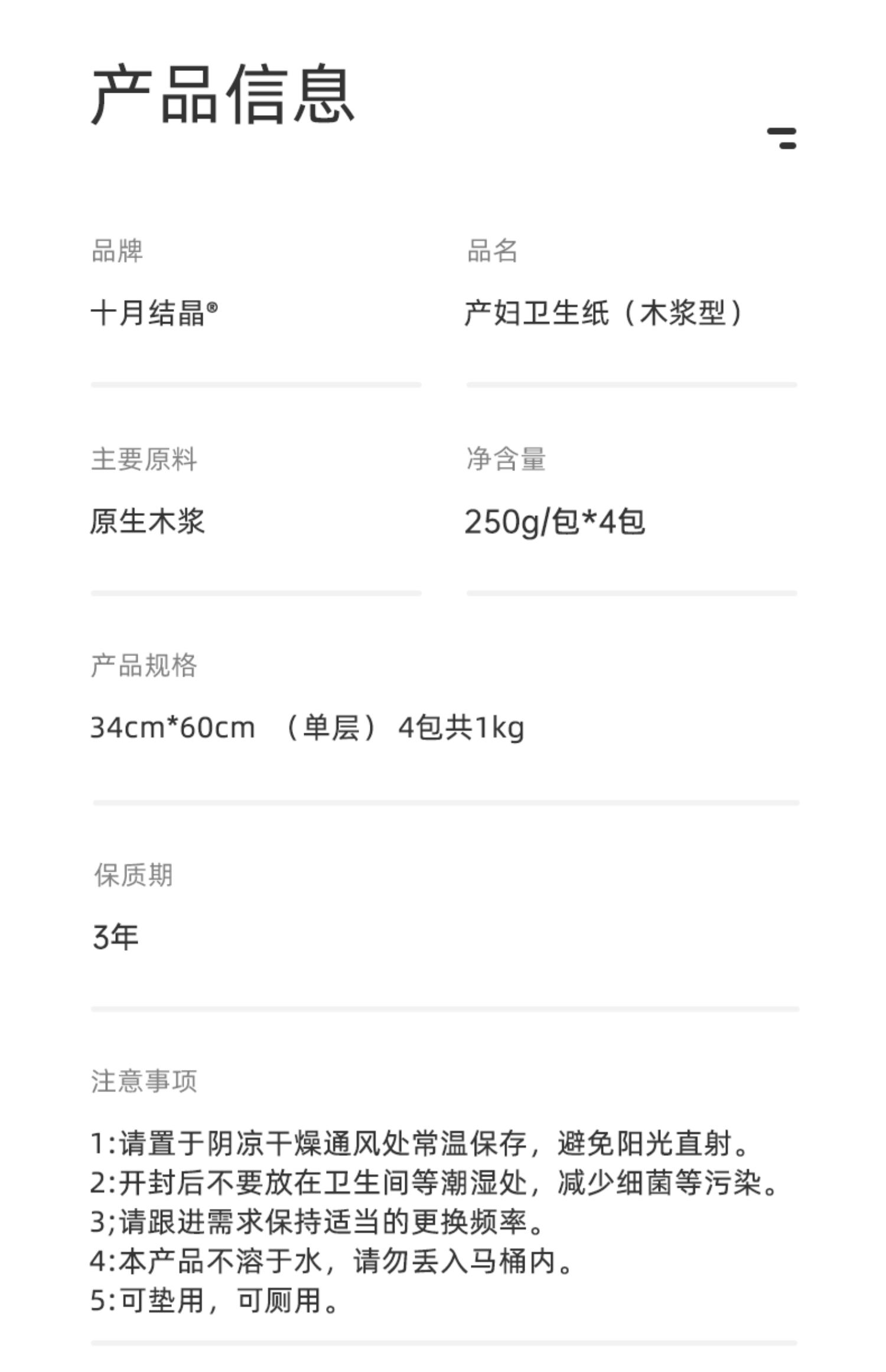商品介绍:十月结晶月子纸产妇刀纸(250g*4包)
